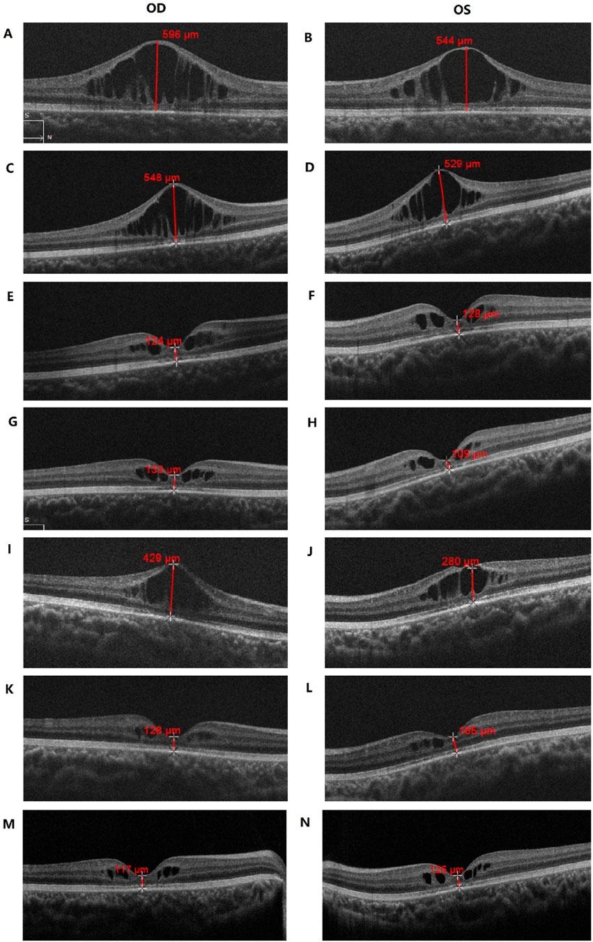 Figure 2. OCT examination results of the patient. (A,B) Macular OCT of the patient before treatment; (C–H) Macular OCT after 1-(C,D), 2-(E,F) and 3-(G,H) months of topical brinzolamide, showing progressive improvement in macular schisis; (I,J) Macular OCT 3 months after brinzolamide was stopped, with worsening macular schisis; (K–N) Macular OCT after resuming brinzolamide for 6-(K,L) and 18- (M,N) months, demonstrating improvement in macular schisis.