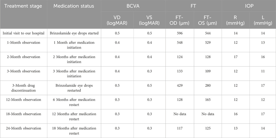 During the follow-up period, the patient’s intraocular pressure (IOP) remained within the normal range all the time. BCVA, FT and IOP of the patients during the follow-up are detailed in Table 1.