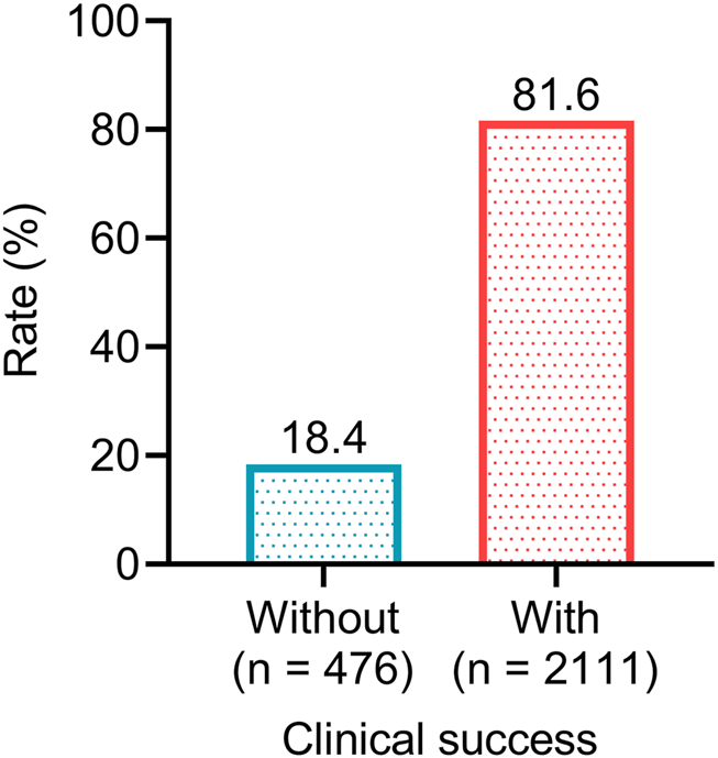 After omadacycline treatment, a total of 2,111 patients achieved resolution or significant improvement of infection-related signs and symptoms, and did not require salvage antimicrobial therapy, resulting in a clinical success rate of 81.6%. The other 476 (18.4%) patients failed to achieve clinical success (Figure 1). The above data suggested that the efficacy of omadacycline was acceptable for the treatment of infectious diseases.