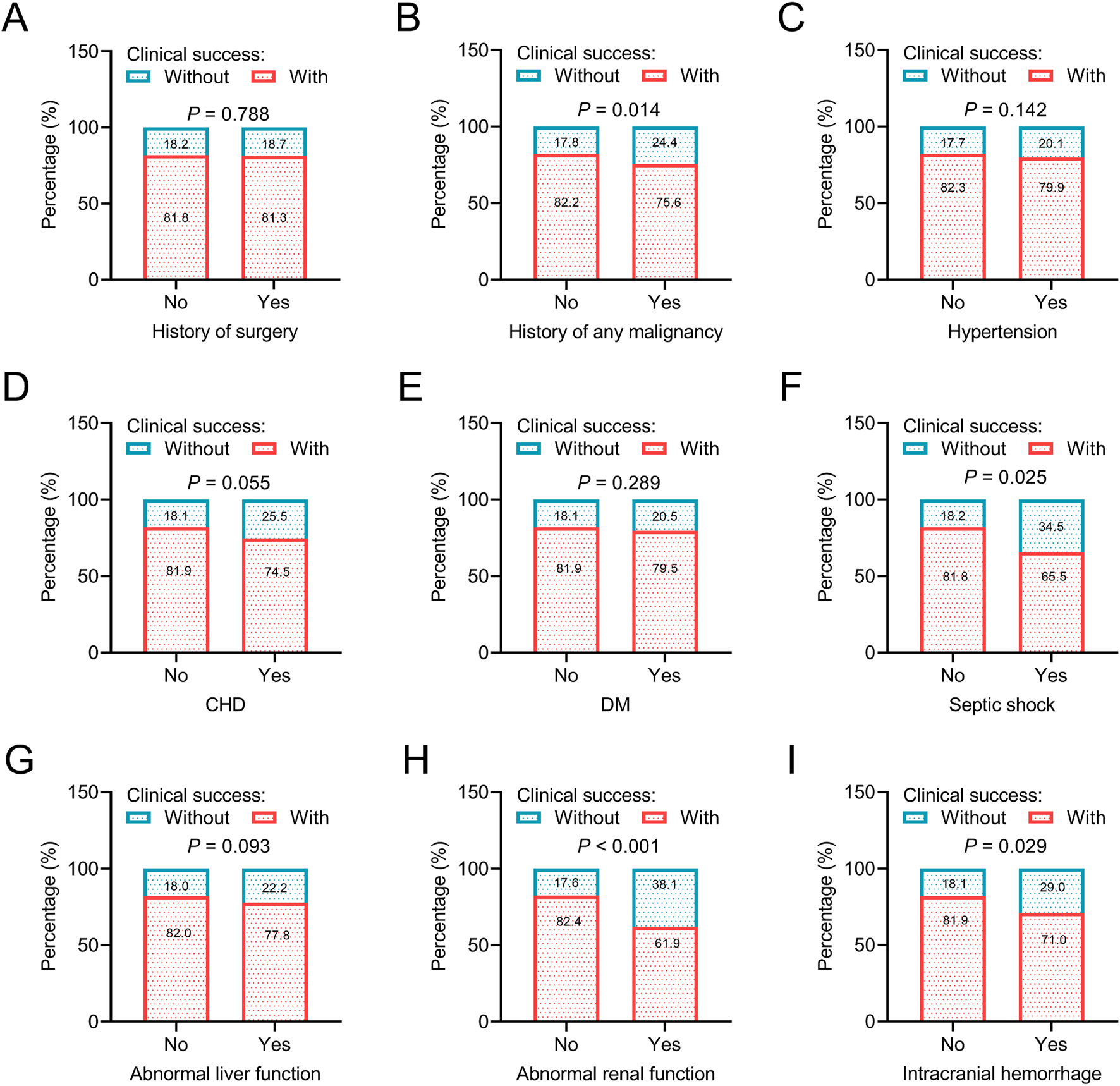 Association of disease histories and comorbid conditions with clinical success. Association of history of surgery (A), history of any malignancy (B), hypertension (C), CHD (D), DM (E), septic shoch (F), abnormal liver function (G), abnormal renal function (H), and intracranial hemorrhage (I) with clinical success in patients receiving omadacycline.