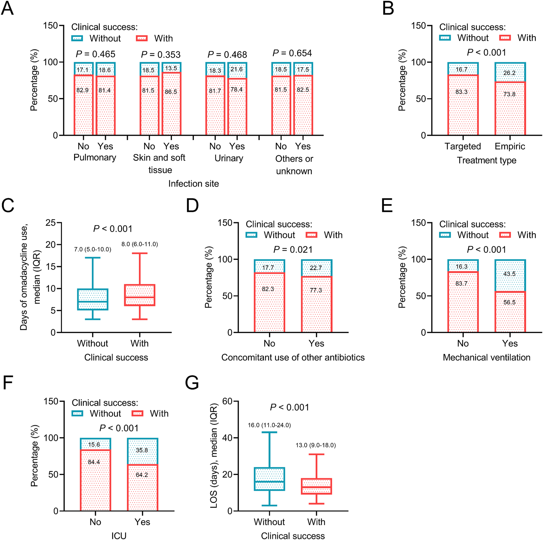Association between treatment information and clinical success. Association of infection site (A), treatment type (B), days of omadacycline use (C), concomitant use of other antibiotics (D), mechanical ventilation (E), ICU (F), and LOS (G) with clinical success in patients receiving omadacycline.