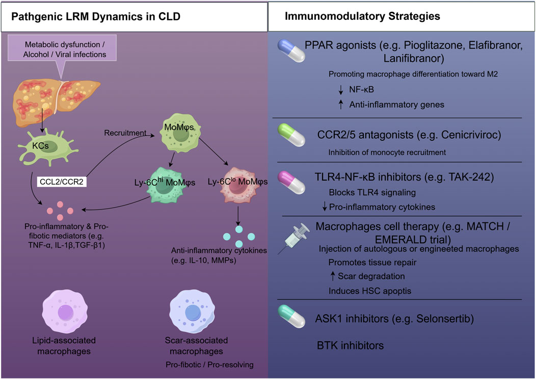 Crucially, the term “LRM” encompasses a functionally and ontogenically diverse population. The two principal subsets are the embryonically derived, self-renewing Kupffer cells (KCs) and the dynamically recruited, bone marrow-derived monocyte-derived macrophages (MoMφs) (van der Heide et al., 2019; Flores Molina et al., 2022). KCs are the long-term residents, integral to the liver’s architecture and homeostatic functions (Elsherif and Alm, 2022; Flores Molina et al., 2022; Bennett et al., 2023). In contrast, MoMφs are rapidly recruited from the circulation during injury, primarily via the CCL2-CCR2 chemokine axis (Ma et al., 2024; Qian et al., 2024). Once in the liver, they exhibit remarkable plasticity, differentiating into functionally distinct subsets, classically distinguished in murine models by Ly-6C expression. Functionally, the Ly-6Chi subset predominantly executes pro-inflammatory and pro-fibrotic programs, while the Ly-6Clo subset is chiefly implicated in tissue repair and the resolution of fibrosis (Elsherif and Alm, 2022; Ma et al., 2024; Ran et al., 2025). This functional dichotomy between KCs and MoMφs, and among MoMφ subsets, is a cornerstone of CLD pathogenesis and a critical consideration for therapeutic design (Bennett et al., 2023).