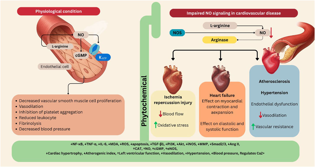 Many phytochemicals exhibit antioxidant properties that help to increase NO bioavailability. For instance, polyphenols can elevate NO levels by reducing oxidative stress and improving endothelial function. This action not only increases NO availability but also protects against ROS-mediated degradation (Kooshki and Hoseini, 2014; Malekmohammad et al., 2020).