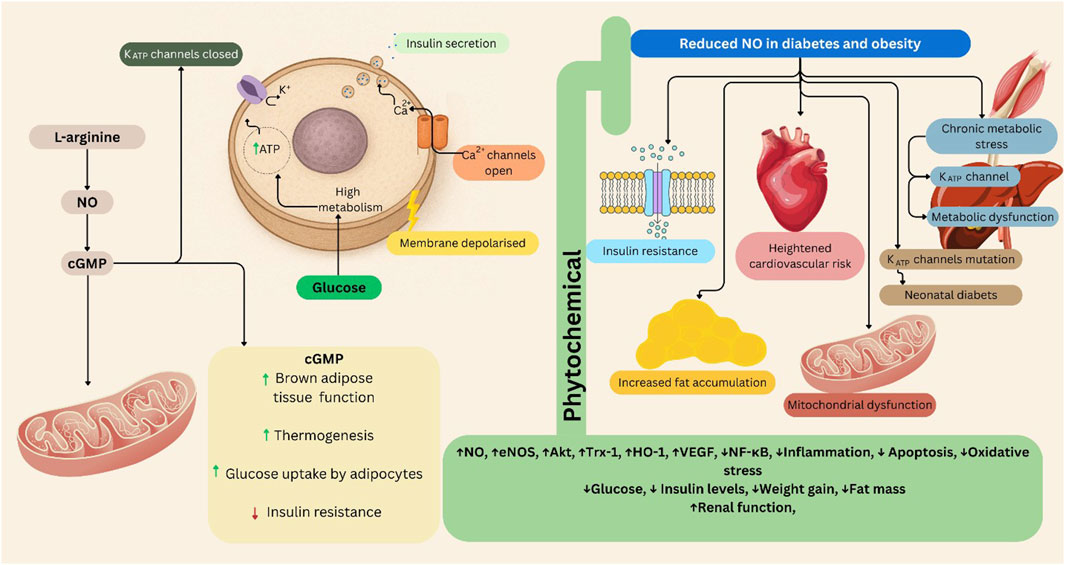 Figure 2. The L-arginine/NO/cGMP/KATP pathway in obesity and diabetes, and the role of phytochemical interventions. This schematic illustrates the role of the L-arginine/NO/cGMP/KATP signaling pathway in glucose metabolism, insulin secretion, and metabolic dysfunction. Left panel (Physiological condition): Under normal metabolic conditions, L-arginine-derived NO activates cGMP signaling, which regulates KATP channel activity in pancreatic β-cells and mitochondria. This enhances glucose uptake by adipocytes, stimulates thermogenesis in brown adipose tissue, and promotes insulin secretion following membrane depolarization and Ca2+ influx. These processes collectively improve insulin sensitivity and energy homeostasis. Right panel (Reduced NO in diabetes and obesity): In metabolic diseases such as obesity and type 2 diabetes, NO bioavailability is diminished due to oxidative stress and chronic inflammation. This impairs cGMP signaling, leading to insulin resistance, mitochondrial dysfunction, fat accumulation, and KATP channel abnormalities that contribute to neonatal diabetes and increased cardiovascular risk. Central section (Phytochemical modulation): Phytochemicals restore NO signaling and modulate eNOS and molecular pathways, thereby improving glucose utilization, reducing fat mass and oxidative stress, and enhancing mitochondrial and renal function. These effects counteract metabolic and cardiovascular complications associated with obesity and diabetes. Akt: Protein kinase B, cGMP: Cyclic Guanosine Monophosphate, eNOS: Endothelial Nitric Oxide Synthase, HO-1: Heme Oxygenase-1, NF-κB: Nuclear Factor kappa B, NO: Nitric Oxide, Trx-1: Thioredoxin-1, VEGF: Vascular Endothelial Growth Factor. Figures were Created by Canva.