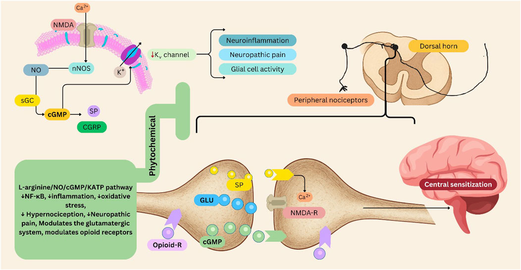 Figure 3. L-arginine/NO/cGMP/KATP pathway in pain management, its modulation by phytochemicals. This figure illustrates the involvement of the L-arginine/NO/cGMP/KATP pathway in pain, and the modulatory role of phytochemicals. Activation of nNOS via NMDA receptor–mediated Ca2+ influx stimulates NO production. NO activates sGC, increasing cGMP levels, which influence KATP channel activity. This cascade modulates neurotransmitter release—including GLU, SP, and CGRP—and contributes to neuronal hyperpolarization and analgesic responses. Dysregulation of this pathway contributes to neuroinflammation, glial activation, and central sensitization within the dorsal horn and brain regions involved in pain perception. Peripheral nociceptor sensitization and enhanced glutamatergic transmission exacerbate neuropathic pain. Phytochemical modulation: Phytochemicals can attenuate NF-κB activation, oxidative stress, and inflammatory signaling, thereby reducing hypernociception and neuropathic pain. They may also modulate the glutamatergic system and enhance opioid receptor–mediated antinociception, offering potential non-opioid strategies for pain management. cGMP: Cyclic Guanosine Monophosphate, CGRP: Calcitonin Gene-Related Peptide, NF-κB: Nuclear Factor Kappa B, NMDA: N-Methyl-D-Aspartate, NO: Nitric Oxide, nNOS: Neuronal Nitric Oxide Synthase, sGC: Soluble Guanylate Cyclase, SP: Substance P. Figures were Created by Canva.