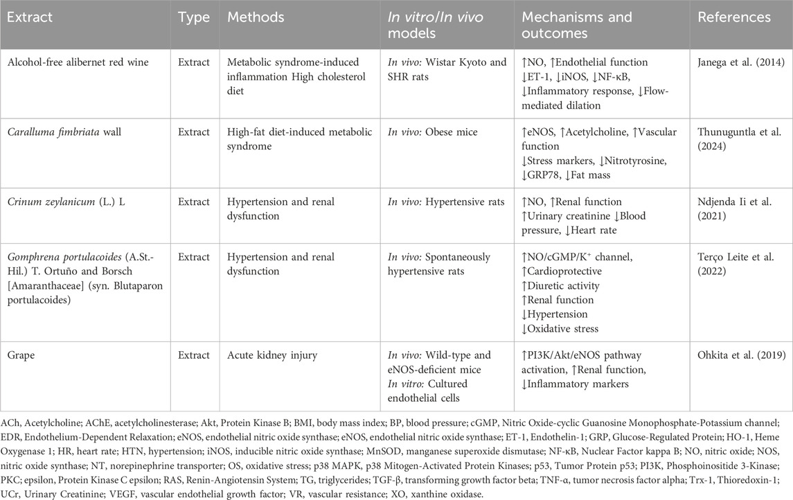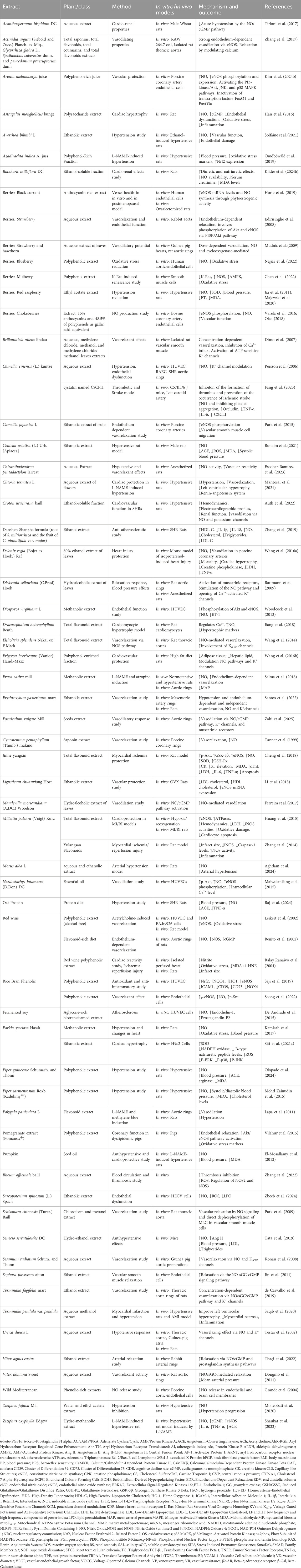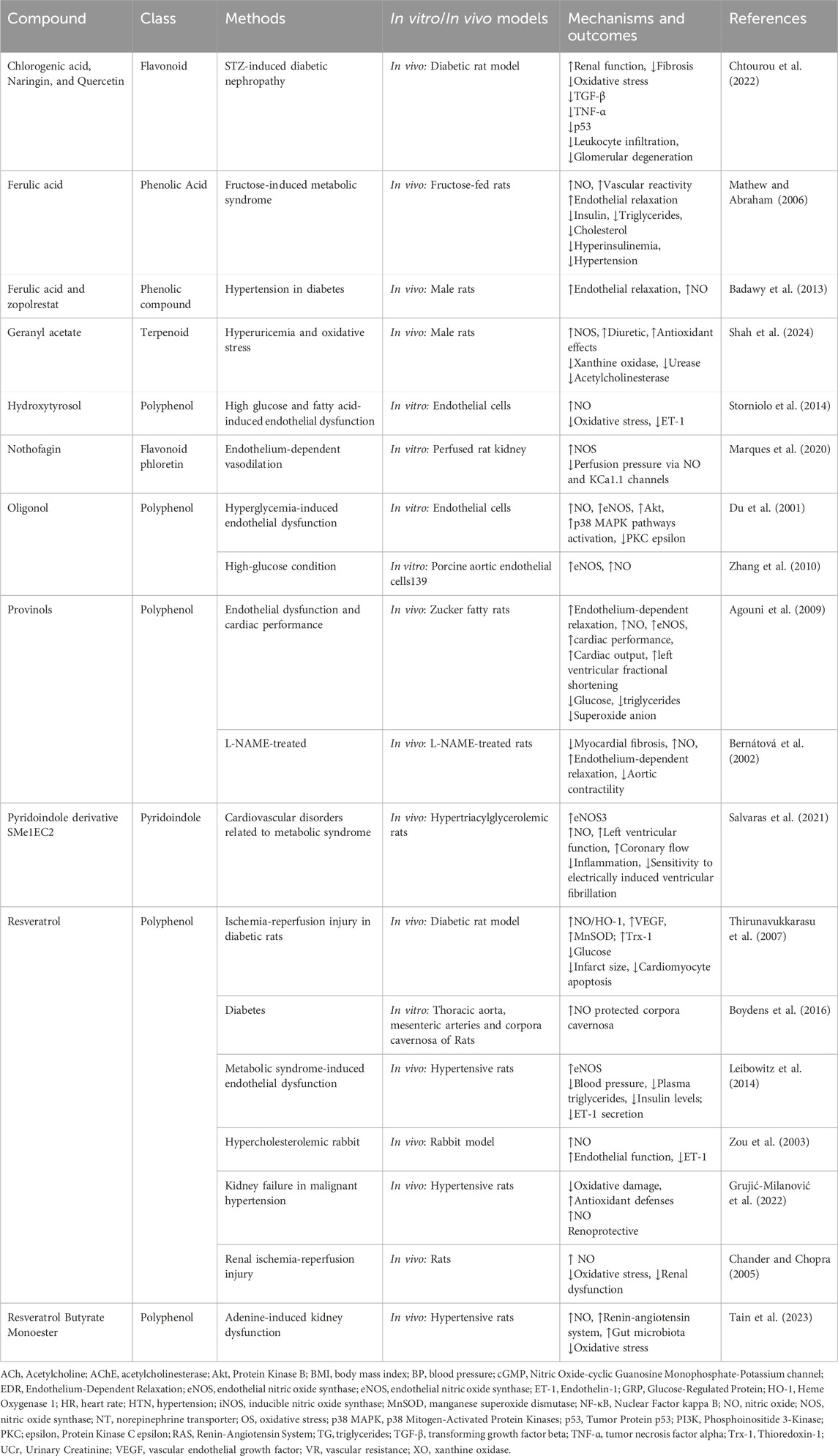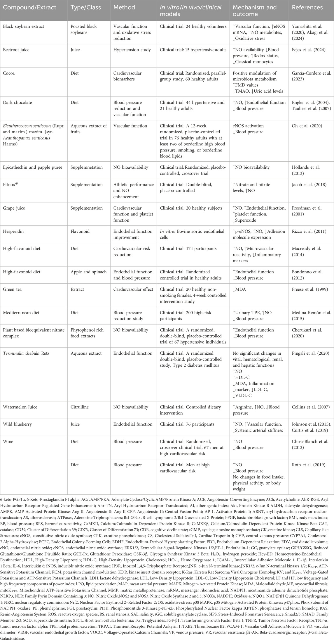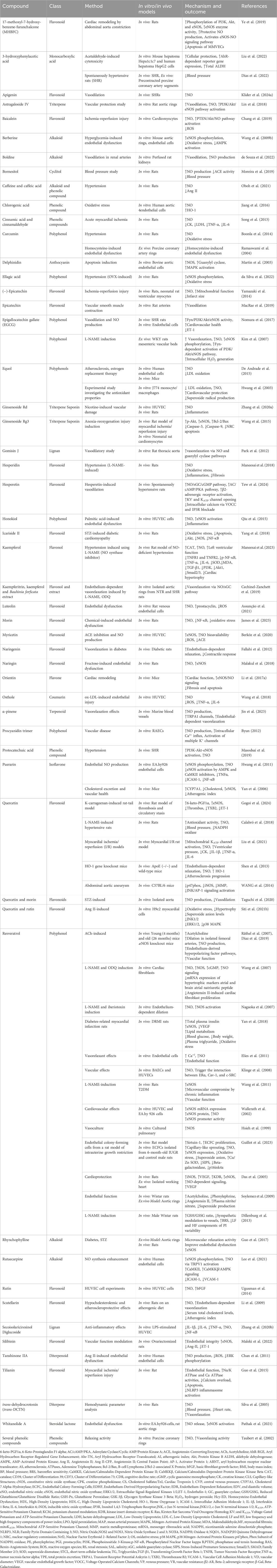 Gogoi et al.’s study indicated that quercetin derived from Solanum lasiocarpum Dunal [Solanaceae] (syn. Solanum indicum) exhibits both anticoagulant and antithrombotic effects in vivo. Quercetin significantly inhibited thrombus formation triggered by k-carrageenan in the rat-tail model. Additionally, in a model of acute circulatory stasis, quercetin was found to lower the levels of thromboxane B2 (TXB2) and ET-1, while simultaneously enhancing the levels of eNOS and 6-keto prostaglandin F1α (6-keto-PGF1α) (Gogoi et al., 2024). Quercetin administration effectively prevented the rise in blood pressure and the activation of nicotinamide adenine dinucleotide phosphate (NADPH) oxidase, but did not alter the decrease in NOS activity induced by L-NAME. Additionally, quercetin positively influenced oxidative stress markers, thereby improving NO bioavailability by regulating superoxide production (Calabró et al., 2018). In their study, Liu et al. proposed that the protective effects of quercetin in myocardial ischemia/reperfusion models are associated with the activation of mitochondrial KATP channels and NO pathways. Quercetin notably improved ventricular pressure and reduced creatine kinase release. Furthermore, it lowered the levels of inflammatory cytokines, including IL-1β, TNF-α, and IL-6 (Liu et al., 2021). Quercetin supplementation (0.05% w/w) significantly reduced atherosclerosis in ApoE (−/−) mice and improved endothelium-dependent relaxation in wild-type mice. Mechanistic analysis revealed enhancements in NO bioavailability and increased heme oxygenase-1 (HO-1) expression, contributing to its protective effects against oxidant-induced endothelial dysfunction. However, quercetin did not mitigate endothelial dysfunction in arteries from HO-1 gene knockout mice, indicating a critical relationship between HO-1 induction and quercetin’s efficacy (Shen et al., 2013). Wang et al. investigated quercetin’s role in inhibiting abdominal aortic aneurysm formation in male C57BL/6 mice, revealing that quercetin treatment reduced the expression of key proteins involved in oxidative stress and inflammation, such as p47phox and iNOS, and inhibited matrix metalloproteinase activation. These quercetin’s protective effects may be mediated through c-Jun N-terminal kinases (JNK)/activator protein-1 signaling pathways (Wang et al., 2014).