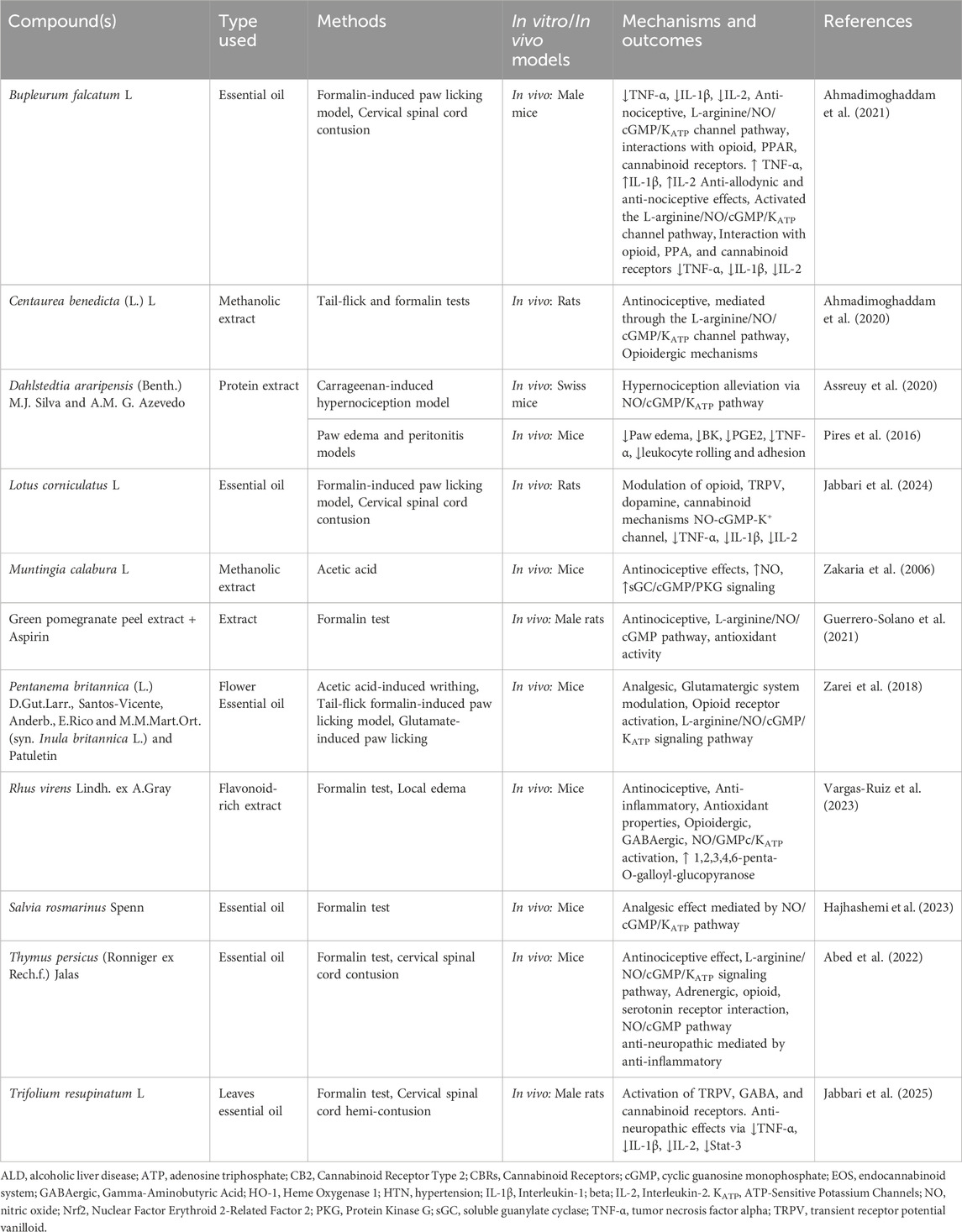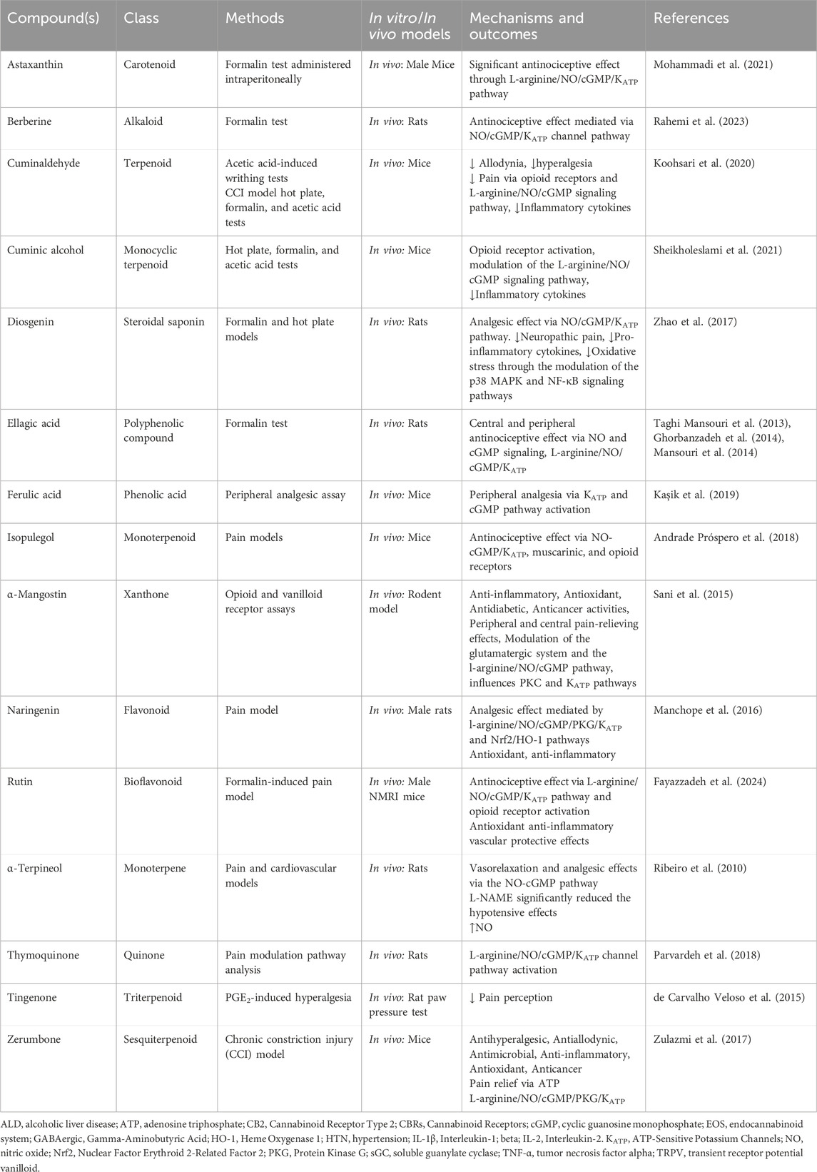 Conventional pharmacological approaches, including phosphodiesterase (PDE) inhibitors and NO donors, have demonstrated efficacy in modulating this pathway; however, they often come with a range of side effects and limitations (ElHady et al., 2023). In recent years, there has been growing interest in the therapeutic potential of phytochemicals—bioactive compounds derived from plants—as modulators of the L-arginine/NO/cGMP/KATP pathway (Parvardeh et al., 2018; Rahemi et al., 2023). These compounds often exhibit anti-inflammatory, antioxidant, and analgesic properties, making them valuable in the treatment of various health conditions. These compounds are typically well tolerated, possess a wide safety margin, and exhibit multiple health benefits, making them attractive candidates for therapeutic intervention (Majid et al., 2015; Zhang et al., 2015; Zhu et al., 2018).