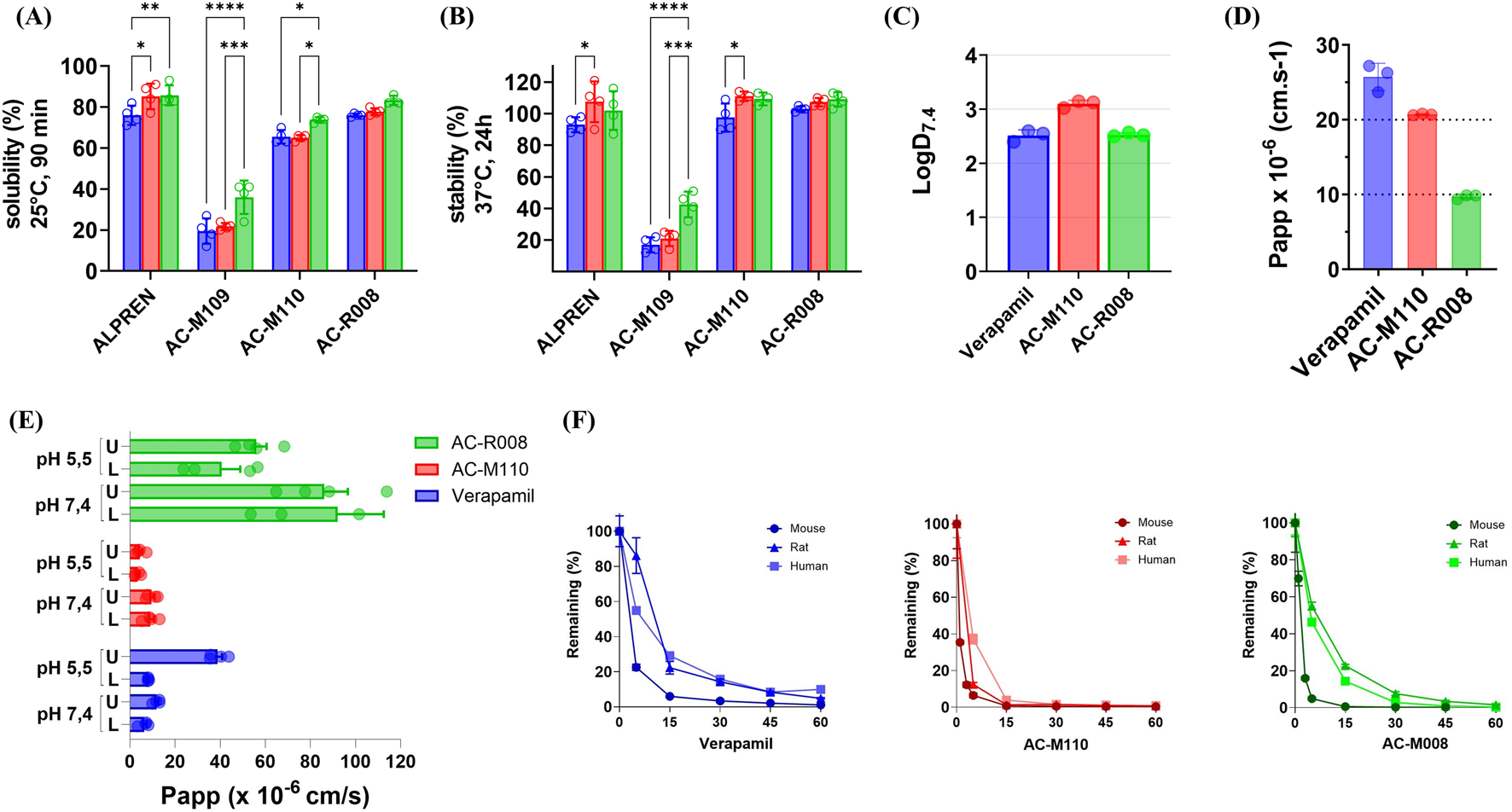 In vitro ADME. (A) Kinetic solubility and (B) chemical stability were evaluated at three pH values: 1.7 (blue bars), 7.4 (green bars), and 8.9 (blue bars). (C) LogD7.4, (D) Caco-2 permeability assay, and (E) PAMPA permeability assay, compounds were introduced into the donor compartment on either the upper (U) or lower (L) side. The x-axis shows permeability values (cm/s), and the y-axis lists the compounds tested. Measurements were taken after 6 h of incubation. (F) Microsomal stability profiles of Verapamil, AC-M110, and AC-R008 in liver microsomes from mouse, rat, and human. The percentage of parent compound remaining over time was determined by LC-MS/MS. Data represent the mean ± standard deviation (SD) of three independent experiments (n = 3). Statistical significance was assessed using two-way ANOVA followed by Tukey’s multiple comparison test. Adjusted p values are indicated by asterisks (*p ≤ 0.05; **p ≤ 0.01; ***p ≤ 0.001; ****p ≤ 0.0001).