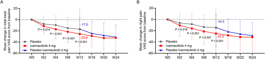 Figure 1. Total back pain and night pain. The mean change in total back pain (A) and night pain (B) VAS scores from baseline in ivarmacitinib and placebo/placebo-ivarmacitinib groups.