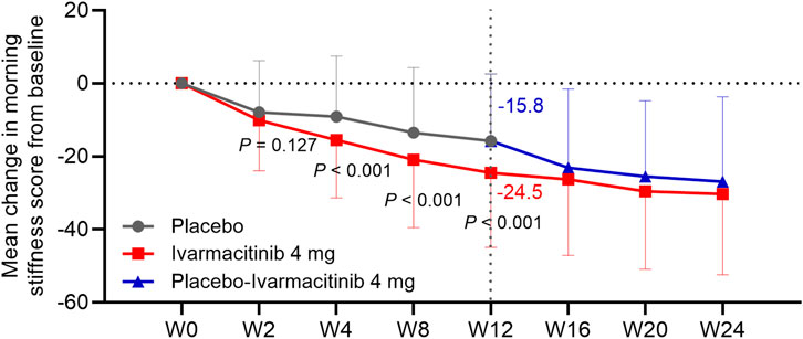 Figure 2. Morning stiffness. The mean change in morning stiffness score from baseline in ivarmacitinib and placebo/placebo-ivarmacitinib groups.