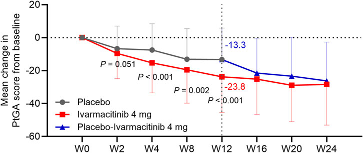 Figure 3. PtGA. The mean change in PtGA score from baseline in ivarmacitinib and placebo/placebo-ivarmacitinib groups.