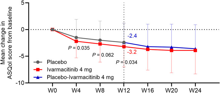 Figure 4. ASQol. The mean change in ASQol score from baseline in ivarmacitinib and placebo/placebo-ivarmacitinib groups.