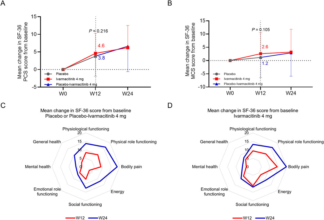 Figure 5. SF-36 PCS and MCS. The mean change in SF-36 PCS (A) and MCS (B) scores from baseline in ivarmacitinib and placebo/placebo-ivarmacitinib groups. The mean change in different dimensions of SF-36 from baseline in placebo/placebo-ivarmacitinib (C) and ivarmacitinib (D) groups.
