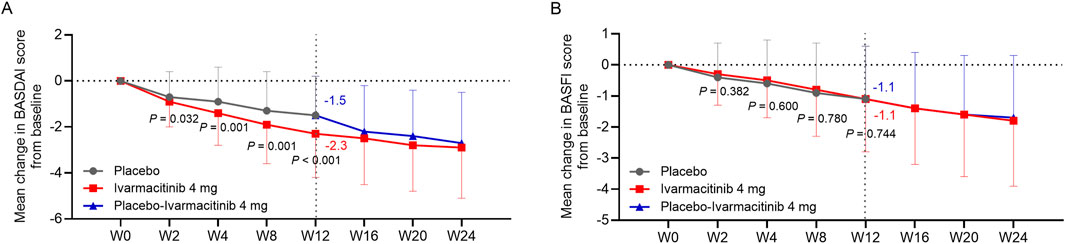 Figure 6. BASDAI and BASFI. The mean change in BASDAI (A) and BASFI (B) scores from baseline in ivarmacitinib and placebo/placebo-ivarmacitinib groups.