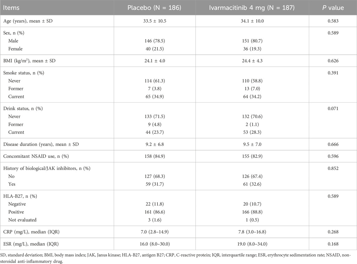 Baseline characteristics were comparable between the ivarmacitinib and placebo groups, which was reported in the phase II/III clinical trial (Liu et al., 2025c). The mean age was 34.1 ± 10.0 years in the ivarmacitinib group and 33.5 ± 10.5 years in the placebo group. Mean disease durations were 9.5 ± 7.0 and 9.2 ± 6.8 years in the two groups, respectively. There were 61 (32.6%) patients in the ivarmacitinib group and 59 (31.7%) patients in the placebo group had a history of biological/JAK inhibitors. The median (IQR) levels of CRP at baseline were 7.8 (3.0–16.8) mg/L in the ivarmacitinib group and 7.0 (2.8–14.9) mg/L in the placebo group; meanwhile, those of ESR were 19.0 (8.0–34.0) and 16.0 (8.0–30.0) mg/L in the two groups, respectively (Table 1).
