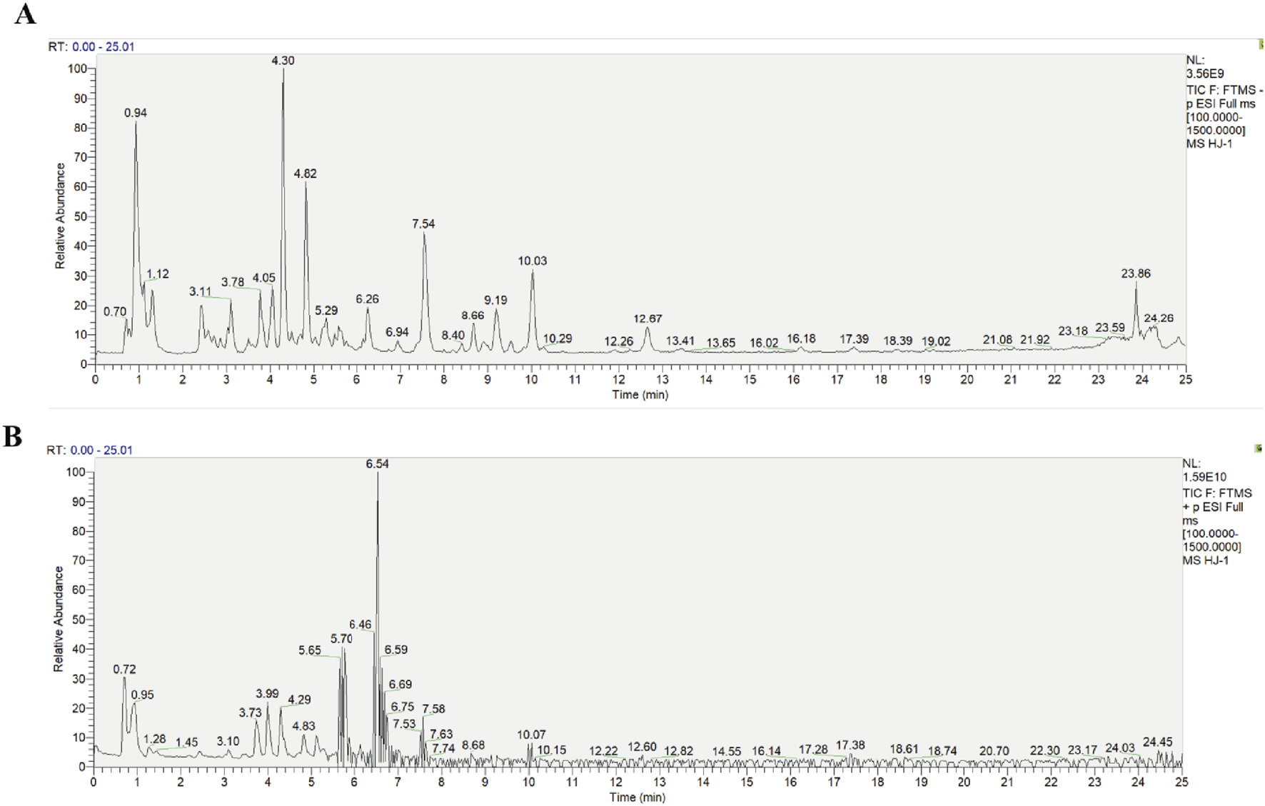 Diagram of the total ion flow of the traditional Chinese medicine metabolite Huang-Lian-Jie-Du Decoction in ion modes. (A) Negative ion mode, (B) Positive ion mode.