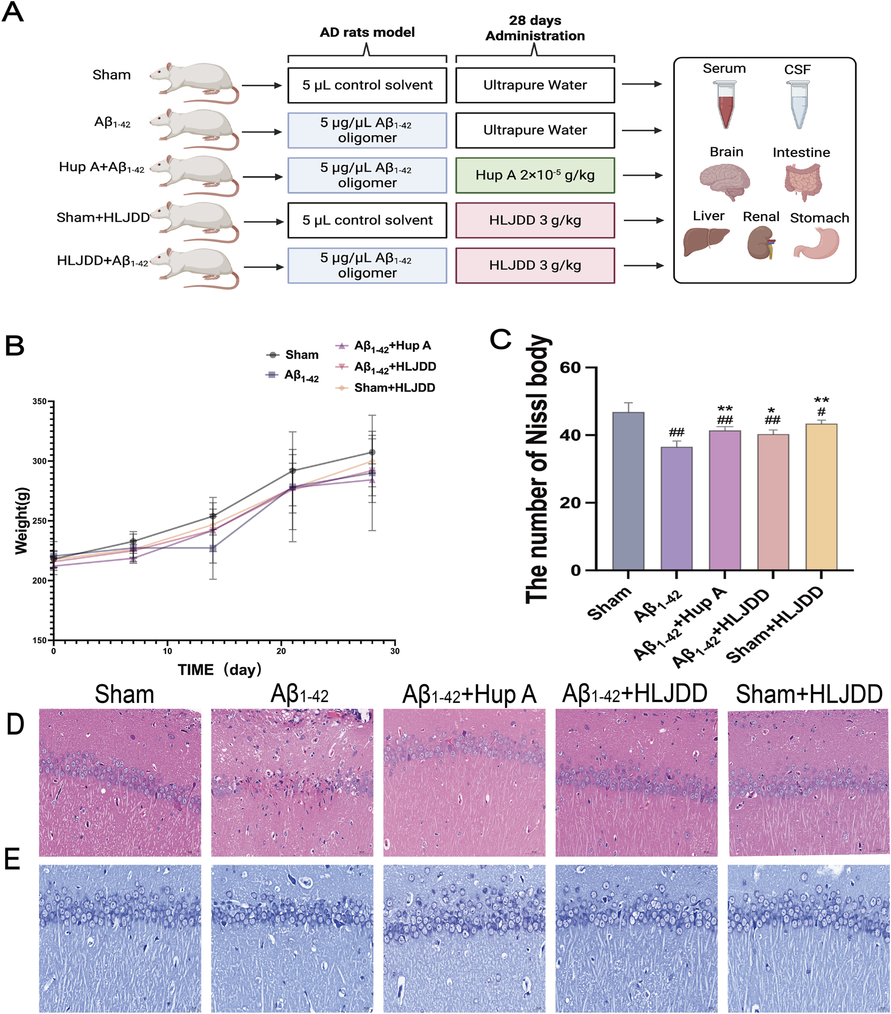 Effect of HLJDD on pathological damage in the brains of Alzheimer’s disease and normal rats. (A) Experimental design, (B) Body weight of rats (n = 6), (C) Number of Nissl bodies (n = 3), (D) H&E staining (Magnification ×400, scale bars: 50 μm) (n = 3), (E) Nissl staining (Magnification ×400, scale bars: 20 μm) (n = 3). Data are presented as means ± SD. #P < 0.05, ##P < 0.01 vs. Sham group; *P < 0.05, **P < 0.01 vs. Aβ1-42 group.