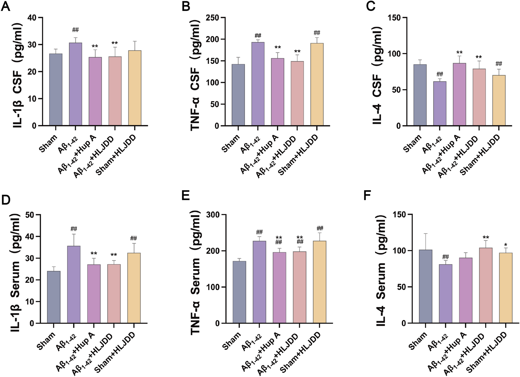 ELISA detection of cytokines (Serum and CSF). (A) IL-1β in CSF, (B) TNF-α in CSF, (C) IL-4 in CSF, (D) IL-1β in serum, (E) TNF-α in serum, (F) IL-4 in serum. Data are presented as means ± SD (n = 6). #P < 0.05, ##P < 0.01 vs. Sham group; *P < 0.05, **P < 0.01 vs. Aβ1-42 group.