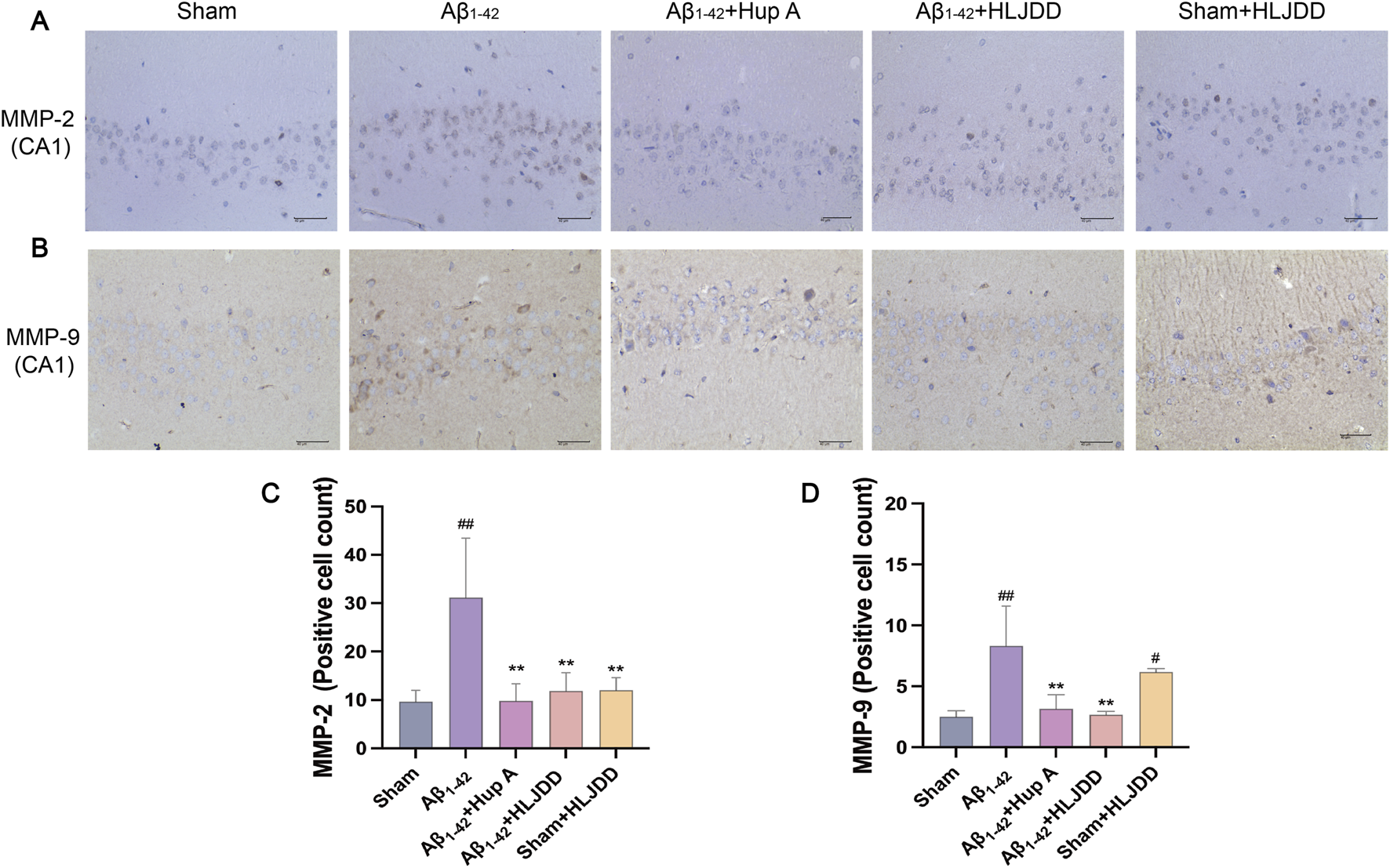 Effect of HLJDD on structural integrity in Alzheimer’s disease and normal rats. (A,C) Representative images of MMP-2 staining in the hippocampal CA1 region of brain tissue, and quantification of MMP-2 expression. (B,D) Representative images of MMP-9 staining in the hippocampal CA1 region of brain tissue, and quantification of MMP-9 expression. (Magnification ×400, scale bars: 40 μm). Data are presented as means ± SD (n = 3). #P < 0.05, ##P < 0.01 vs. Sham group; *P < 0.05, **P < 0.01 vs. Aβ1-42 group.