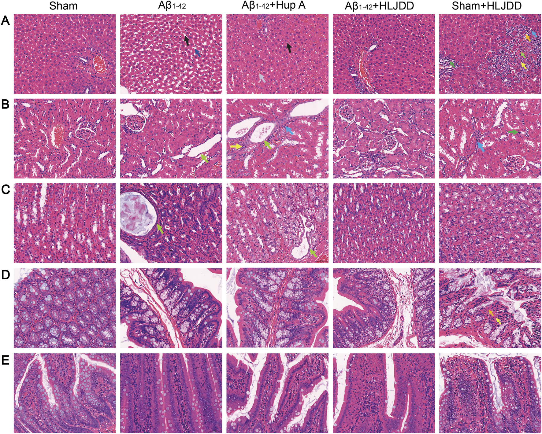 TCM and its components may pose direct organ-damaging toxicity. To evaluate the potential toxicity of HLJDD, H&E staining was conducted on tissues from the liver, kidneys, stomach, large intestine, and small intestine to assess its effects on the digestive system. In liver tissues, the HLJDD-treated sham group exhibited hepatocellular necrosis, inflammatory cell infiltration, and fibrotic tissue proliferation, while the Aβ1-42 and Hup A-treated Aβ1-42 groups showed sporadic minor hepatocyte steatosis and vacuolar degeneration. Importantly, HLJDD treatment in the HLJDD-treated Aβ1-42 group alleviated these liver pathologies (Figure 6A). In renal tissues, the Aβ1-42 group displayed moderate tubular dilatation with flattened tubular epithelial cells, whereas the Hup A-treated Aβ1-42 group showed mild interstitial inflammatory infiltration and subtle fibrotic proliferation. While HLJDD treatment attenuated renal lesions in the HLJDD-treated Aβ1-42 group, the HLJDD-treated sham group exhibited tubular epithelial swelling, luminal dilatation, proteinaceous casts, inflammatory infiltration, and fibroplasia (Figure 6B). Gastric analysis revealed mild glandular dilatation with epithelial flattening in the Aβ1-42 and Hup A-treated Aβ1-42 groups, which was mitigated in the HLJDD-treated Aβ1-42 group. No gastric abnormalities were observed in the HLJDD-treated sham group (Figure 6C). In colonic tissues, mucosal epithelial detachment, lamina propria necrosis, inflammatory infiltration, and villous dissolution were found exclusively in the HLJDD-treated sham group, with no significant lesions in other groups (Figure 6D). The small intestines in all experimental groups remained structurally intact with no significant histopathological changes (Figure 6E). These results suggest that HLJDD can mitigate pathological damage in the renal and gastric tissues of AD rats. Although serum samples were unavailable for biochemical analysis of indicators such as ALT and AST, histopathological examination clearly revealed tissue injury. Overall, histopathological findings indicated that HLJDD’s toxic effects in normal rats are associated with damage to the liver, kidneys, and large intestine.