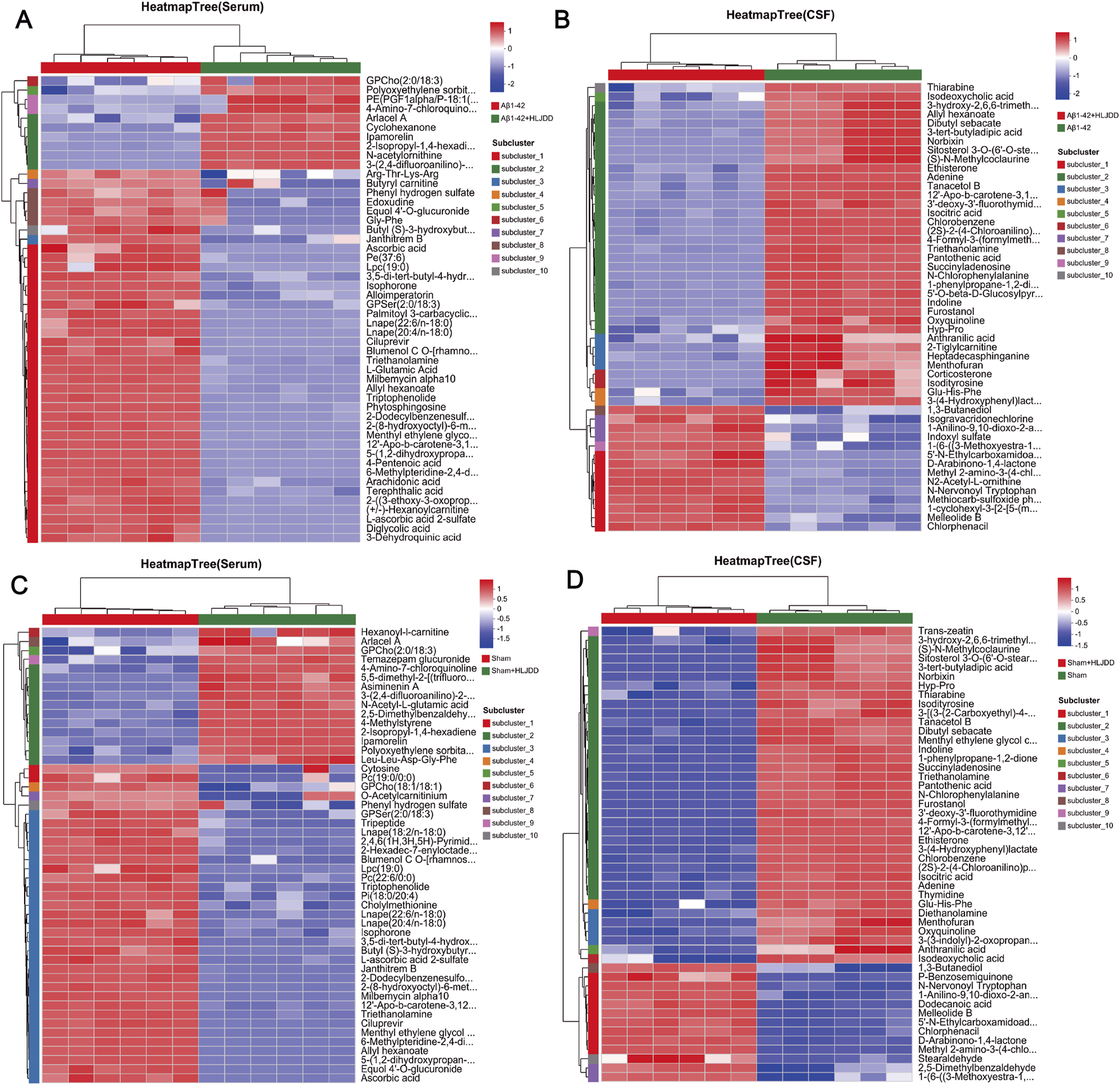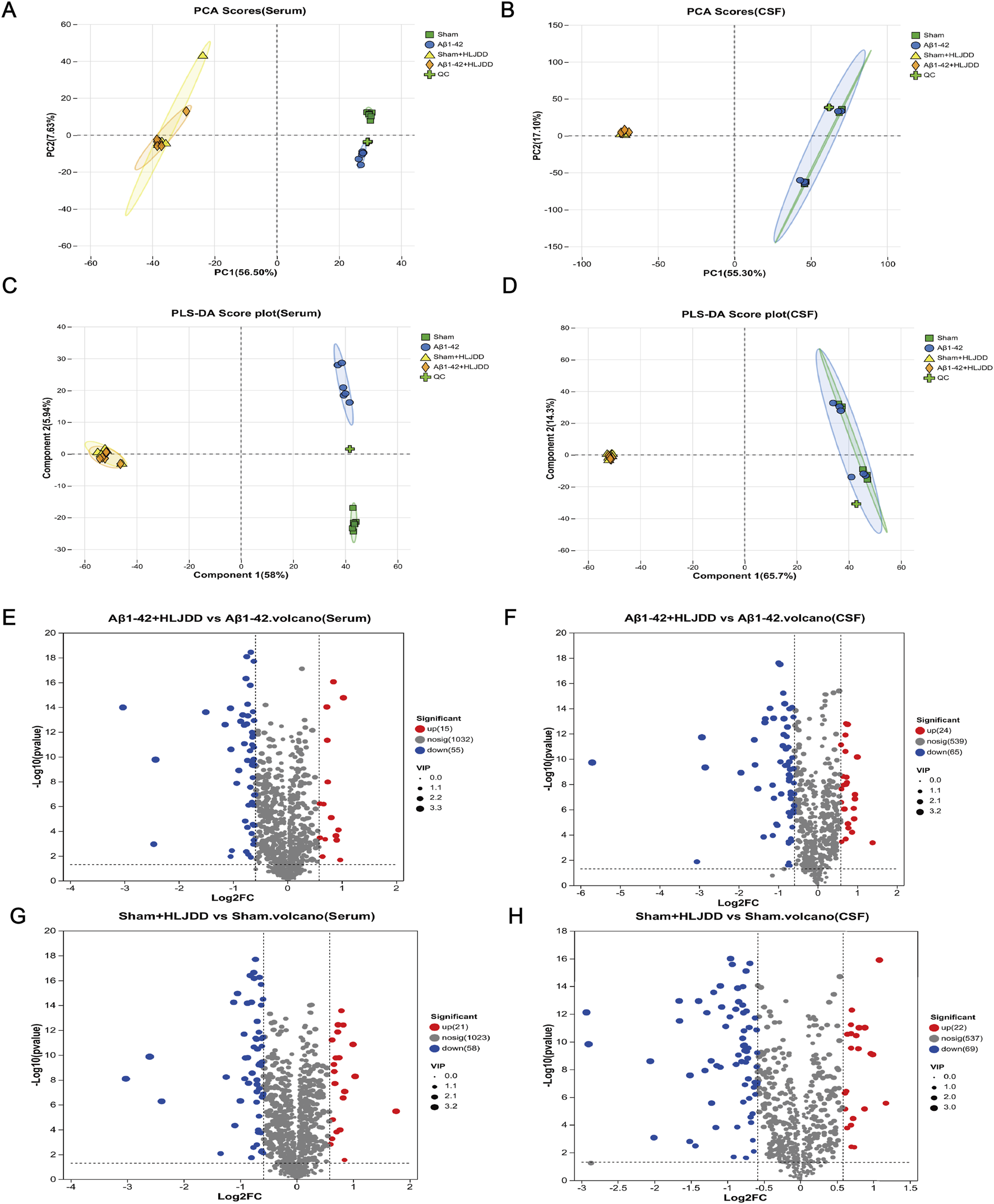 Differences in the metabolic microenvironment influence the body’s response to drug treatments. This study examined the variations in HLJDD metabolism in the peripheral and central regions of AD and normal rats using LC-MS analysis on CSF and serum samples. Multivariate analysis, including PCA and PLS-DA, revealed distinct metabolomic profiles among the Sham, Sham + HLJDD, Aβ1-42, and Aβ1-42 + HLJDD groups. The presence of clusters in the QC samples confirmed the stability of the analytical system, demonstrating good reproducibility and instrument reliability during the analysis (Figures 7A–D). The results indicated the presence of both conserved and differential metabolic constituents under normal and pathological conditions. Using a t-test (P < 0.05) and VIP >1, with a fold change threshold of 1.5, differential metabolites between the groups were identified. Comparative metabolomic analysis revealed significant alterations in metabolite profiles across experimental groups. In serum, 70 differentially expressed metabolites (DEMs) were identified between the HLJDD-treated Aβ1-42 group and the Aβ1-42 group, with 15 upregulated and 55 downregulated metabolites. Similarly, 89 DEMs were detected in CSF, including 24 upregulated and 65 downregulated metabolites. For the sham-operated groups, 79 DEMs were observed in serum between the HLJDD-treated sham group and the sham group (21 upregulated, 58 downregulated), while 91 DEMs were identified in CSF (22 upregulated, 69 downregulated) (Figures 7E–I).