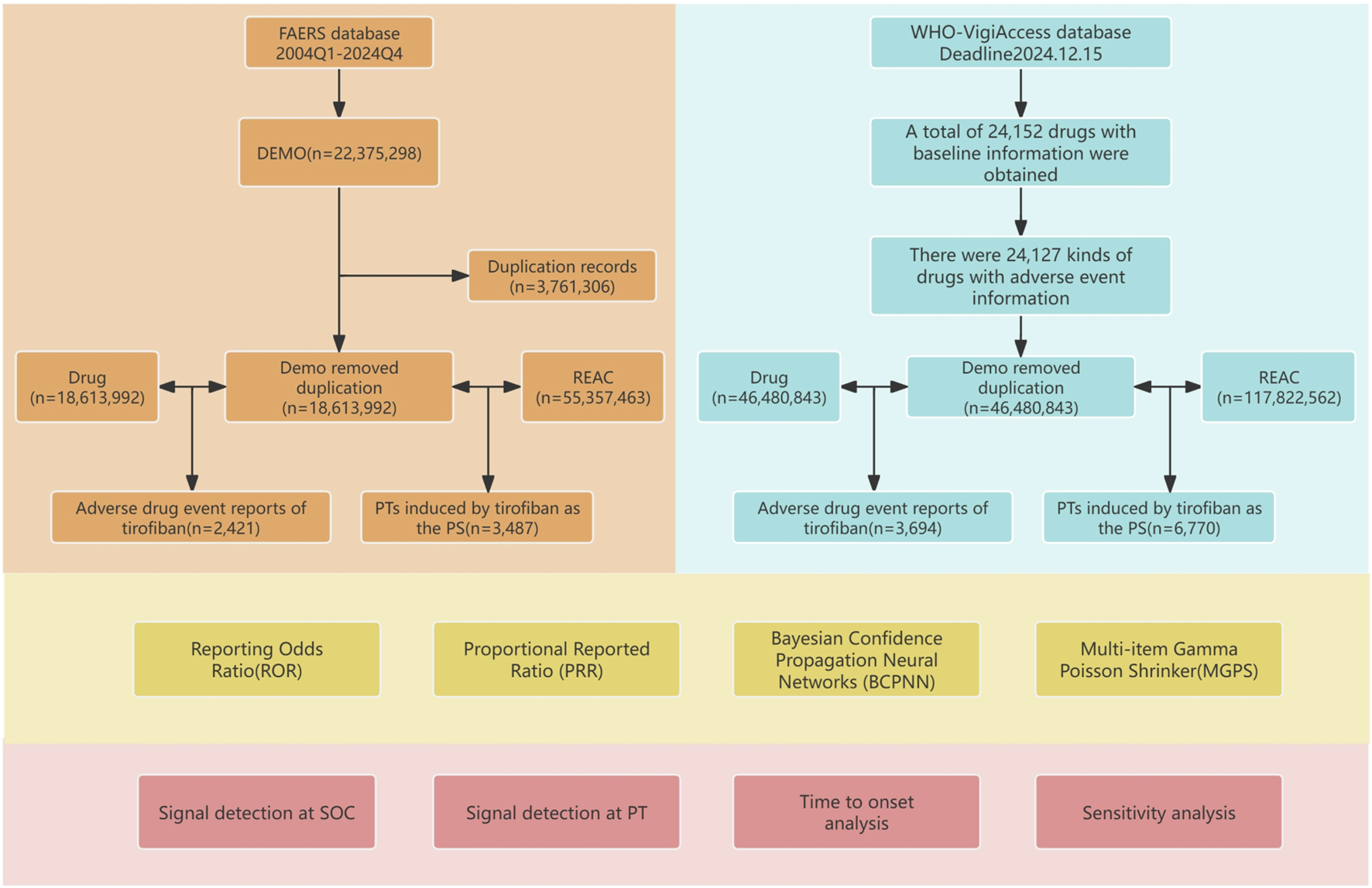 We obtained data from the FAERS database for a total of 84 quarters, ranging from the first quarter of 2004 (2004Q1) to the fourth quarter of 2024 (2024Q4). Additionally, on December 15, 2024, we accessed the WHO-VigiAccess database to retrieve the relevant AE report data. In these datasets, tirofiban was designated as a primary suspected (PS) drug. A Suspect product is defined as a drug or biologic that the reporter believes to be associated with the reported AE.
