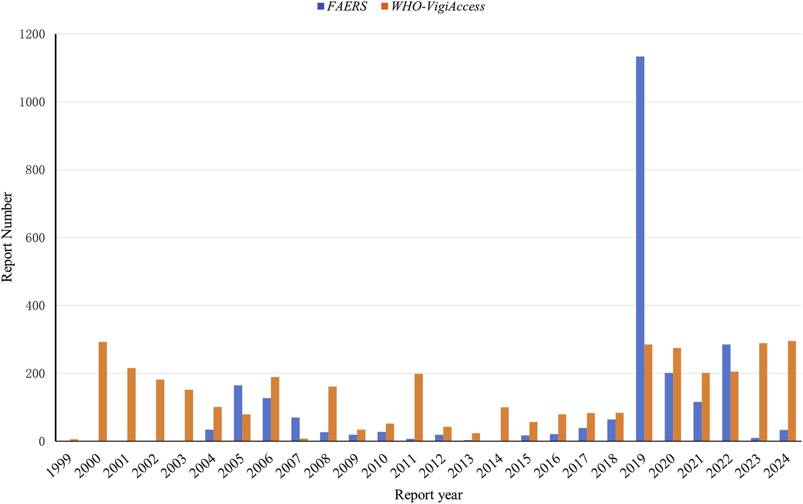Annual distribution of AE reports involving tirofiban in the FAERS and WHO-VigiAccess databases.