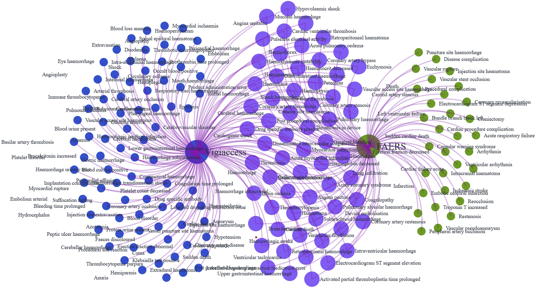 AEs was categorized according to the System Organ Class (SOC) system. The number of PTs under each SOC was ranked in descending order. Tirofiban-related AEs were distributed across 24 SOCs in the FAERS dataset and 25 SOCs in the WHO-VigiAccess dataset, as detailed in Supplementary Tables S4, S5. Among these, 23 SOCs were shared between the two databases, as summarized in Table 2. Notably, three SOCs emerged as key contributors in both databases based on the disproportionality analysis. These included cardiac disorders (n = 862 in FAERS, n = 497 in WHO-VigiAccess, vascular disorders (n = 547 in FAERS, n = 648 in WHO-VigiAccess), and blood and lymphatic system disorders (n = 293 in FAERS, n = 1,569 in WHO-VigiAccess). In the FAERS database, cardiac disorders represented the most frequently reported and most strongly signaled SOC. In contrast, in the WHO-VigiAccess database, blood and lymphatic system disorders were the most prevalent and prominently signaled SOC.