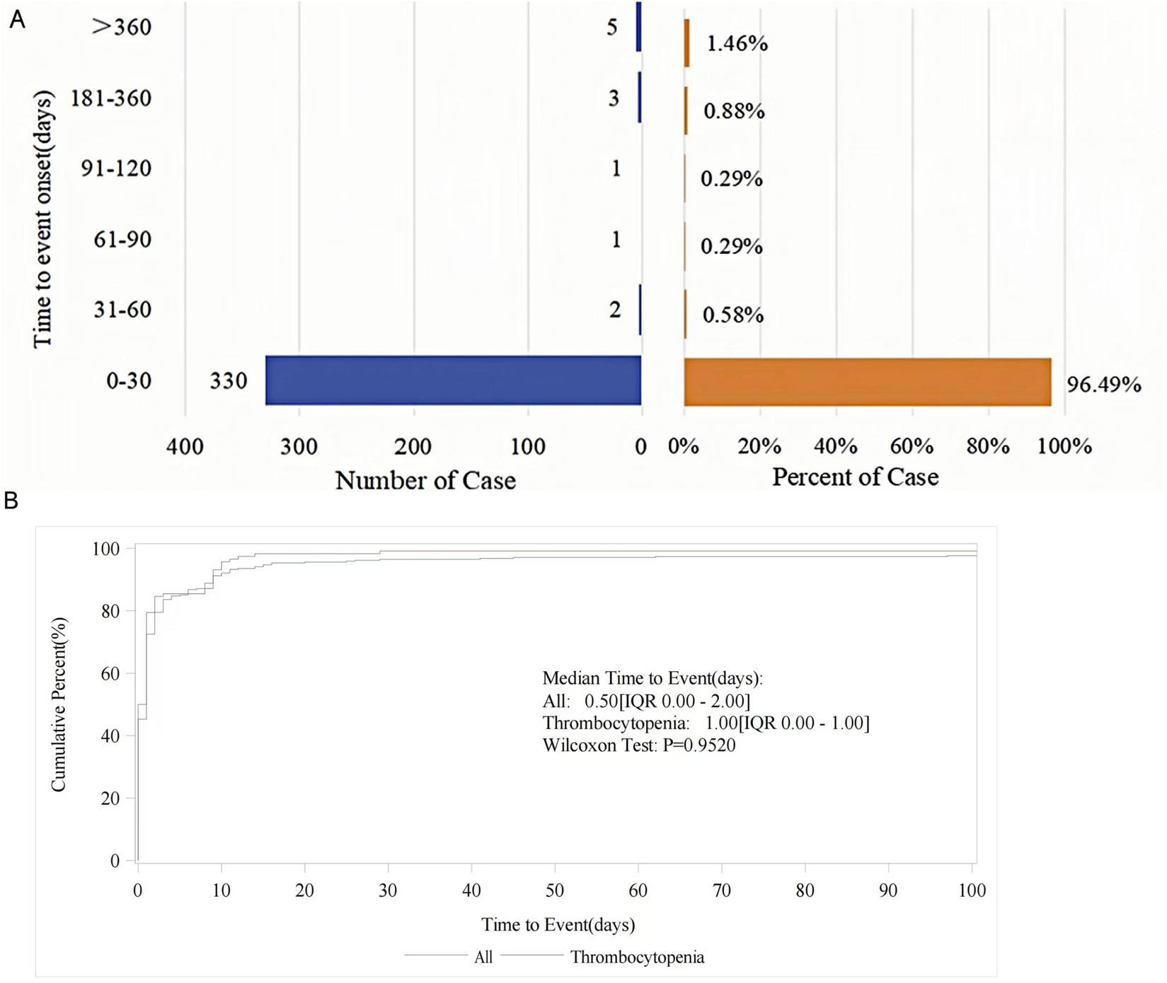 To thoroughly evaluate the TTO characteristics, we utilized several statistical measures, including the median, interquartile range, minimum, maximum, and Weibull shape parameters (Kinoshita et al., 2020). The Kaplan-Meier method was used to illustrate the cumulative incidence of AEs associated with tirofiban (Wang Q. et al., 2024). Changes in the incidence of AE risk over time can be identified and predicted by the Weibull distribution test. This distribution is characterized by two parameters: the scale parameter (α), which determines the proportion or width of the distribution, and the shape parameter (β), which influences the curvature of the distribution. In our analysis of onset time, the shape parameter was crucial to predict the hazard of AEs over time, categorizing the outcome as early, random, or wear-out failure type. When β is less than 1 and its 95% confidence interval (CI) is also below 1, it suggests a decreasing risk of AEs over time, indicating an early failure pattern. Conversely, if β is approximately 1 and its 95% CI contains 1, the risk is estimated to remain constant over time, representing a random failure pattern. Finally, if β exceeds 1 and its 95% CI does not encompass 1, it implies an increasing risk over time, characteristic of a wear-out failure pattern (Sauzet et al., 2013; Liu et al., 2024).