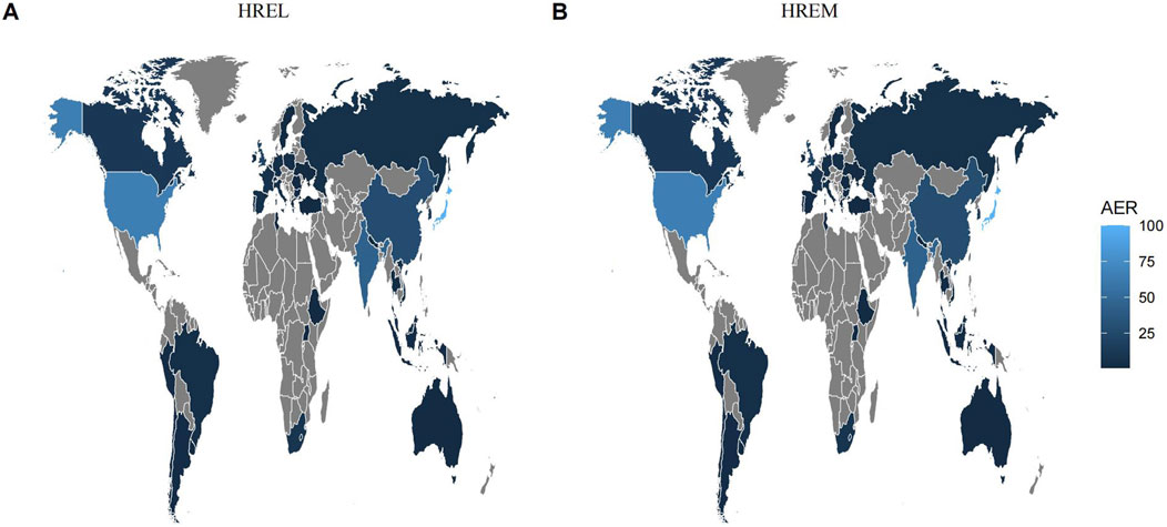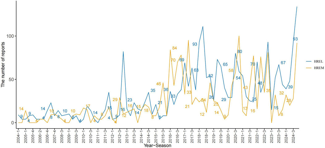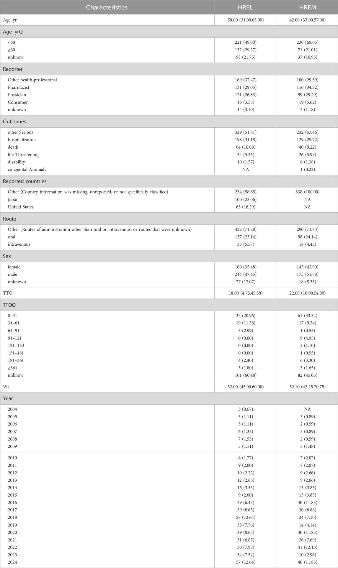 Detailed epidemiological features are shown in Table 3. In this study, we analyzed the treatment outcomes and demographic characteristics of 451 and 338 patients treated with HREL and HREM, respectively. The AEs for both regimens showed a gradual increasing trend, reaching a peak in 2024 (Figure 1). The median age of patients in the HREL group was 50 years, compared to 42 years in the HREM group, with interquartile ranges of 31–65 years and 33–57 years, respectively. The majority of reports were submitted by other healthcare professionals (169 in the HREL group and 100 in the HREM group), followed by pharmacists and physicians. Reports contributed by consumers were the least, with 16 in the HREL group and 19 in the HREM group. Regarding outcomes, other serious outcomes were most frequently reported (329 in the HREL group and 232 in the HREM group), followed by hospitalization and death. Geographically, Figure 2 shows the global distribution of AE reports. Reports with a specified country of origin were mainly from Japan and the United States, with 100 and 65 cases in the HREL group, respectively. All 338 cases in the HREM group had no specified country of origin, which limits our understanding of the geographic distribution of AEs. The route of administration was mostly unknown for most AEs. In terms of gender distribution, the number of female reports was similar between the HREM group (145) and the HREL group (160), while the number of male reports was higher in the HREL group (214) than in the HREM group (175).