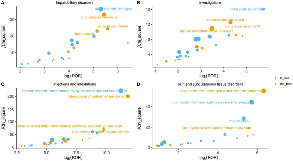 At the PT level, Figure 3 visualizes the disproportionality analysis signals for key AEs across different organ systems (Panels A–D). In this analysis, the association strength is plotted on the X-axis as log2 (ROR), where values greater than 0 indicate a positive association. The statistical significance, measured by √χ2, is plotted on the Y-axis, where higher values indicate a lower probability that the association occurred by chance. The bubble size is proportional to the report count for each event. A signal was considered significant and the corresponding AE was labeled on the plot only if it met the pre-defined thresholds for all four disproportionality analysis algorithms simultaneously (Table 2). All signal details are presented in Supplement Materials 1.