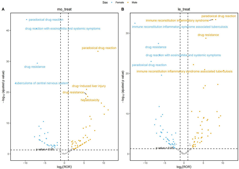 The most prominent signal observed in female patients receiving HREL therapy was for IRIS-TB (ROR = 6,532.74, 95% CI: 3,338.12–12784.65), representing a 5.4-fold higher risk compared to male patients (ROR = 1,201.87). Concurrently, female patients demonstrated significantly elevated risk of drug-induced liver injury (ROR = 55.90) compared to males (ROR = 32.98). Among male patients treated with HREM, the risk of thalamic infarction was particularly notable (ROR = 691.55, 95% CI: 324.80–1,472.40), followed by brain stem infarction (ROR = 213.75). Regarding the HREM regimen, female patients demonstrated substantially higher risk of drug reaction with eosinophilia and systemic symptoms (ROR = 140.81) compared to male patients (ROR = 43.78). Concurrently, significantly stronger risk signals were observed in females for acute generalized exanthematous pustulosis (ROR = 89.53), jaundice (ROR = 33.06), and cholestasis (ROR = 21.52).