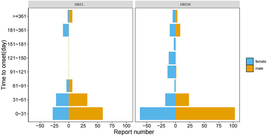 To ensure the cohort specifically represented patients exposed to the target multidrug regimens, case selection was performed with the following criteria. A case was included in the HREL cohort only if it contained reports for all four constituent drugs: isoniazid, rifampicin, ethambutol, and levofloxacin. Similarly, a case was included in the HREM cohort only if it contained reports for isoniazid, rifampicin, ethambutol, and moxifloxacin. Cases reporting any additional anti-tuberculosis drugs beyond these core combinations were excluded to maintain regimen specificity and minimize confounding. The role code of AEs is designated by the reporter, including Primary Suspect (PS), Secondary Suspect (SS), Concomitant (C), and Interaction (I). Our analysis was restricted to reports with “role_cod” designated as “PS” in the DRUG file (Zhou et al., 2022; Mascolo et al., 2021; Moore et al., 2022). To ensure that the analyzed AEs were those most directly attributed by the reporter to the fluoroquinolone, the analysis was restricted to reports where the fluoroquinolone component (i.e., levofloxacin for HREL or moxifloxacin for HREM) was designated as the PS drug. Epidemiological baseline information was extracted from these reports, including patient age, reporting country, reporter type, report date, route of administration, outcome, and the timing of drug-related AE occurrence.
