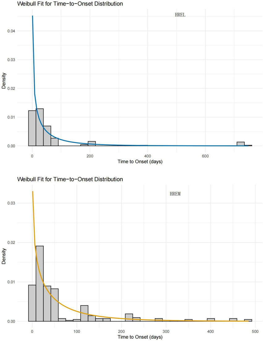 The median time to onset (TTO) was shorter in the HREL group (18 days) compared to the HREM group (22 ays), with interquartile ranges of 4.75–45.50 and 10.00–54.00 days, respectively (Figure 5). Furthermore, we supplemented the Weibull distribution tests for the TTO analysis (Figure 6). The parameter estimates revealed a shape parameter (β) of 0.68 (95% CI: 0.609, 0.751) and a scale parameter (α) of 48.318 (95% CI: 37.107, 59.529) for the HREL group. For the HREM group, the values were β = 0.776 (95% CI: 0.706, 0.846) and α = 55.182 (95% CI: 45.906, 64.458). As the shape parameter β was less than 1 in both groups, AEs demonstrated a tendency to occur early in the treatment course.