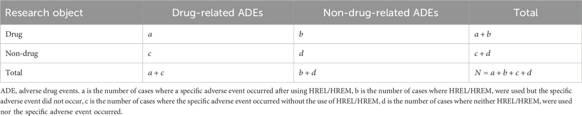 In pharmacovigilance research, disproportionality analysis is a widely used data mining method globally. It assesses the association between drugs and AEs by comparing the observed frequency ratios in exposed versus non-exposed populations using contingency tables (Table 1). We employed this method to identify AEs associated with the HREM and HREL regimens. In this study, we calculated the Reporting Odds Ratio (ROR), Proportional Reporting Ratio (PRR), Bayesian Confidence Propagation Neural Network (BCPNN), and Empirical Bayes Geometric Mean (EBGM). The PRR provides higher specificity (Evans et al., 2001), while the ROR corrects for biases arising from low reporting numbers (Rothman et al., 2004). The EBGM is used for detecting signals of rare events, and the BCPNN performs well in integrating multiple data sources and conducting cross-validation (Bate et al., 1998). To enhance signal reliability and avoid false-positive signals, a signal was considered relevant only when it met the criteria of all four algorithms simultaneously (Shu et al., 2022). Typically, the algorithm scores are higher when the target drug is more likely to induce the target AE compared to all other drugs. Additionally, reference to previous similar studies (Liu et al., 2025; Li et al., 2025; Yang et al., 2024), we adjusted the thresholds and variances to detect more rare AEs. Specifically, by lowering the threshold for all algorithms, we proactively incorporated potential signals that would have been excluded due to high variance back into our scope of scrutiny. This enables our analysis to better capture rare AEs that have low reporting frequencies but potentially very high association strengths. The specific formulas and thresholds for all algorithms are detailed in Table 2. Data extraction was performed using MySQL 8.0, and statistical analyses were conducted using RStudio (version 4.2.2).