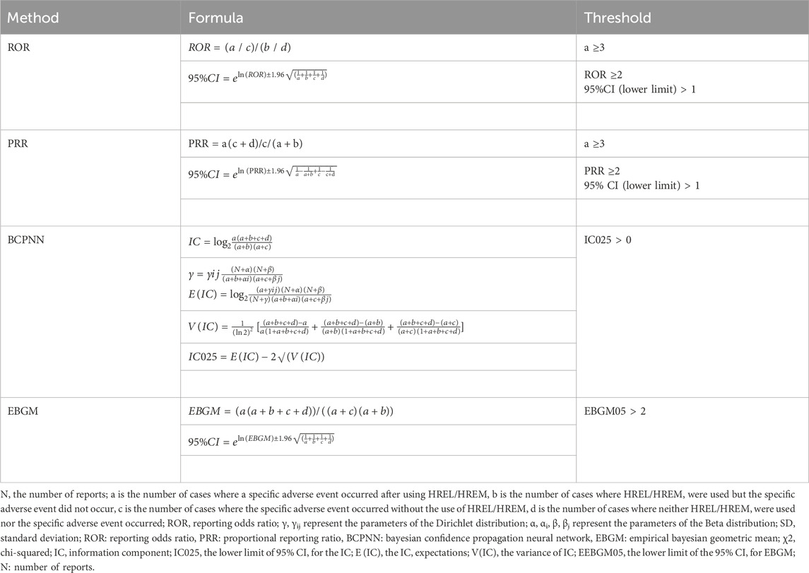 Table 2. Four main algorithms are used to evaluate the correlation between HREL/HREM and AEs. This includes ROR, PRR, BCPNN, and EBGM methods, formulas, and thresholds.