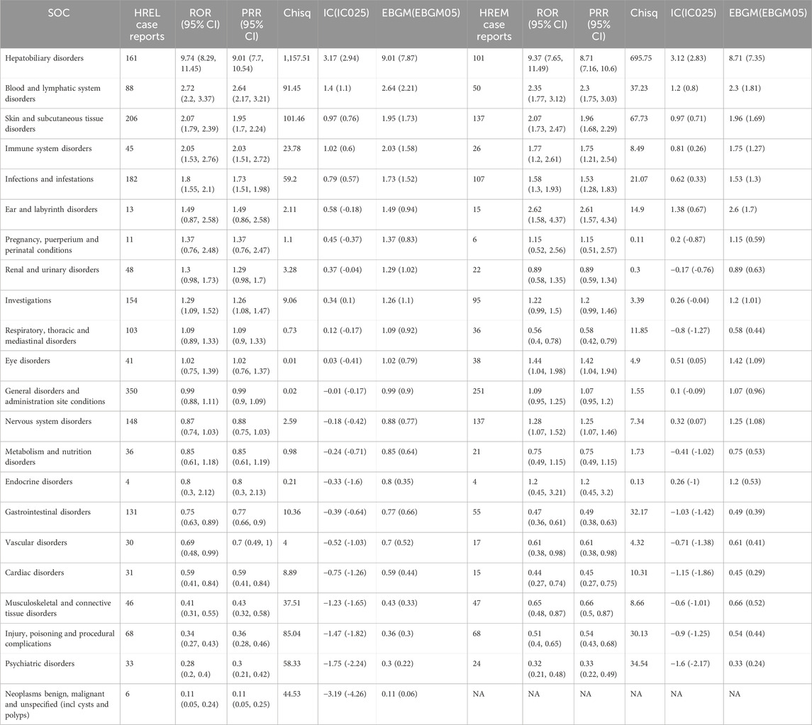 In our pharmacovigilance analysis, using a ROR exceeding 2 as the criterion, we identified SOCs significantly associated with HREL and HREM. For hepatic and biliary disorders, HREL showed a significant ROR of 9.74 (95% CI 8.29, 11.45), while HREM also exhibited a significant ROR of 9.37 (95% CI 7.65, 11.49), highlighting a strong association for both regimens at this SOC level. In blood and lymphatic system disorders, HREL treatment demonstrated a significant ROR of 2.72 (95% CI 2.20, 3.37), higher than that of HREM treatment (ROR 2.35, 95% CI 1.77, 3.12). For skin and subcutaneous tissue disorders, both HREL and HREM treatments had RORs exceeding 2, at 2.07 (95% CI 1.79, 2.39) and 2.07 (95% CI 1.73, 2.47), respectively, indicating similar risk profiles for skin-related AEs with both treatments. In immune system disorders, HREL had an ROR of 2.05 (95% CI 1.53, 2.76), higher than that of HREM treatment (ROR 1.77, 95% CI 1.20, 2.61), suggesting a greater risk of immune system disorders with HREL. For ear and labyrinth disorders, HREM had an ROR of 2.62 (95% CI 1.58, 4.37), higher than that of HREL treatment (ROR 1.49, 95% CI 0.87, 2.58), indicating a stronger association of HREM with ear and labyrinth disorders. All signal details are shown in Table 4.