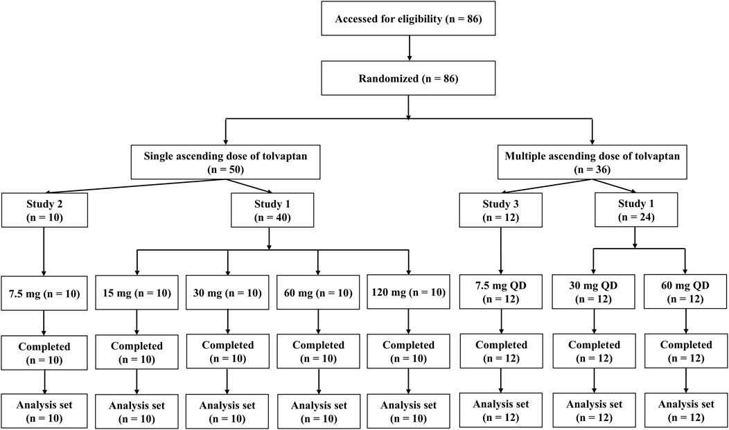 Study 1 (Protocol 156–06-801–01) involved an open-label PK study of tolvaptan tablets in healthy Chinese participants that included both single and multiple dose administration. For single doses, subjects received tolvaptan orally at doses of 15, 30, 60 and 120 mg, separately, under fasting conditions. Plasma samples were collected at pre-dose as well as at 0.5, 1, 1.5, 2, 3, 4, 6, 8, 12, 24, 36, 48, 72, 96, 120 and 144 h post-dose. For multiple doses, subjects were orally administered 30 mg or 60 mg tolvaptan on days 1, 3, 4, 5, 6, 7, 8 and 9 under fasting conditions. Plasma samples were collected at pre-dose and at 0.5, 1, 1.5, 2, 3, 4, 6, 8, 12, 24, 36 and 48 h after drug administration on day 1 and 9. Plasma samples were also collected at pre-dose on days 3–8. Furthermore, the study 2 (Protocol 156–11-807–01) was a single-dose PK study of tolvaptan tablets in healthy Chinese subjects who were orally administered a single 7.5 mg dose of tolvaptan under fasting condition, with plasma samples collected at pre-dose, and then at 0.5, 1, 1.5, 2, 3, 4, 6, 8, 12, 24, 36, 48, 72, 96, 120 and 144 h after drug administration. Finally, study 3 (Protocol 156–11-808–01) was a multiple dose (7.5 mg) PK study of tolvaptan tablets in which healthy Chinese subjects were orally administered 7.5 mg of tolvaptan on days 1, 3, 4, 5, 6, 7, 8 and 9 under fasting conditions, with plasma samples collected at pre-dose, 0.5, 1, 1.5, 2, 3, 4, 6, 8, 12, 24, 36 and 48 h after drug administration on days 1, 4, 5. 6, 7, 8 and 9.