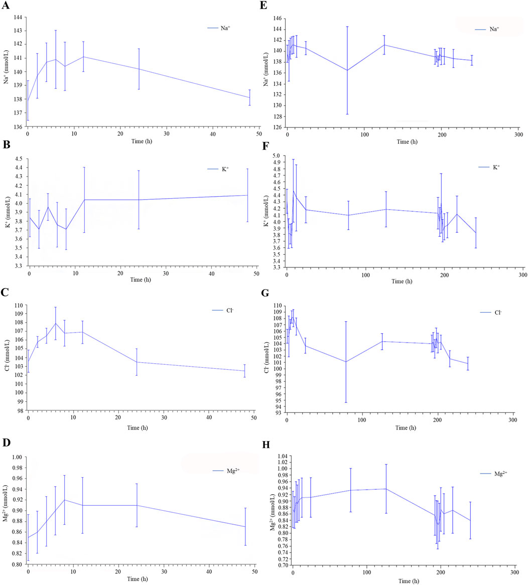 Figure 3. Serum electrolyte results in healthy male subjects after single (A–D) and multiple (E–H) oral doses of tolvaptan tablets.