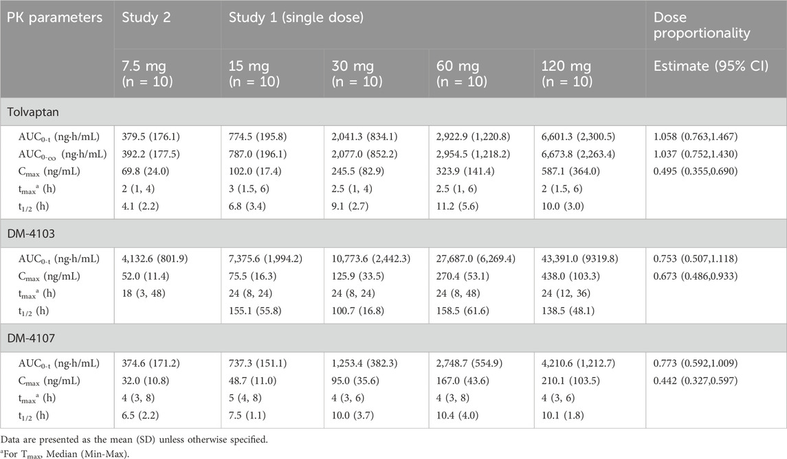 After a single-dose, the AUC0-t and Cmax of tolvaptan and its two principal metabolites increased with the dose. In the 7.5 mg–120 mg range, AUC0-t for tolvaptan and its metabolites showed dose proportionality, while Cmax increased less than dose proportionally. The terminal half-life extended with higher doses, and the time to reach Cmax was consistent across all doses, with a median of 2 h–3 h. Although the 90% CIs for the AUC0-t of DM-4103 and DM-4107 included 1, both AUC0-t and Cmax showed less than dose proportional increases from 7.5 mg to 60 mg. Moreover, following multiple dosing, study participants reached steady-state by Day 7, demonstrating that the Cmax and AUC0-t of tolvaptan increased with dose. AUC0-t increased more than dose proportionally in the range of 7.5 mg–60 mg, whereas Cmax showed dose proportionality.