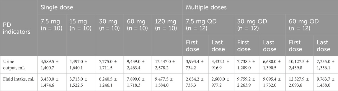 Earlier studies established that the minimum effective concentrations of tolvaptan were reached at a serum concentration of approximately 25 ng/mL, with a maximal increase in urine output measured when tolvaptan concentrations exceeded 100 ng/mL. Interestingly, for single doses ranging from 60 to 480 mg, 0–12 h urine volumes remained comparable, suggesting saturation of effect for the 60 mg dose for up to 12 h post-administration. In a previous report, mean peak serum concentrations following a 15 mg dose were found to be 135.0 ± 53.0 ng/mL and 103.5 ± 39.5 ng/mL (Kim et al., 2011; Yi et al., 2012; Bhatt et al., 2014). These findings indicated an expected dose-dependent relationship in terms of free water clearance and urine volumes for doses ranging from 3.75 mg to 15 mg (Bondanelli et al., 2023). In the trial involving healthy adults, a dose-dependent response was evident, likely due to all individuals receiving all three doses, thereby minimizing subject variability.