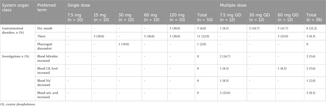 Post-marketing evaluations in Europe have revealed a practice among physicians of splitting or crushing tolvaptan tablets to create a 7.5 mg initial dose for the treatment of hyponatremia to potentially minimize the risk of over-rapid correction of serum Na+ concentrations. As no PK/PD studies have been carried out on SIADH patients with hyponatremia, a trial was undertaken to assess the initial response of serum Na+ concentrations to various tolvaptan doses (Shoaf et al., 2017). Additionally, a prior dose-finding study suggested that a 7.5 mg dose could be as efficacious as higher doses in patients with liver cirrhosis and hepatic edema (Wang et al., 2018), prompting an evaluation of the lower 7.5 mg dose in healthy Chinese subjects following both single and multiple administration of tolvaptan. Furthermore, early investigations into the PK/PD characteristics of 7.5 mg tolvaptan in SIADH patients found that starting titration with 7.5 mg did not eliminate the risk of rapid serum Na+ corrections, with fluid balance monitoring potentially identifying individuals at risk of overcorrection (Tzoulis et al., 2023). The trial focusing on the PK/PD of 7.5 mg tolvaptan demonstrated no clinically significant alterations in serum electrolytes (K+, Na+, Cl−, Mg2+) following oral administration of a 7.5 mg dose. The most frequently reported AEs after single and multiple doses of 7.5 mg tolvaptan were thirst, dry mouth and pharyngeal discomfort, which are anticipated side effects of tolvaptan. Collectively, these findings support the effectiveness of 7.5 mg tolvaptan with a reduced risk of overly rapid correction of the serum Na+ concentration.