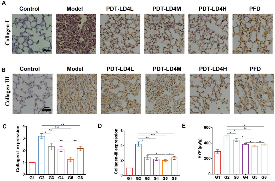 Figure 3. PDT-LD4 alleviated the degree of fibrosis in BLM-induced PF mice. (A–D) Collagen I and Collagen III was detected by immunohistochemical staining and analyzed. (E) BLM induced to a significantly increase of lung HYP levels (n = 4–5). Data were expressed as mean ± SD, *P < 0.05, **P < 0.01, ***P < 0.001.