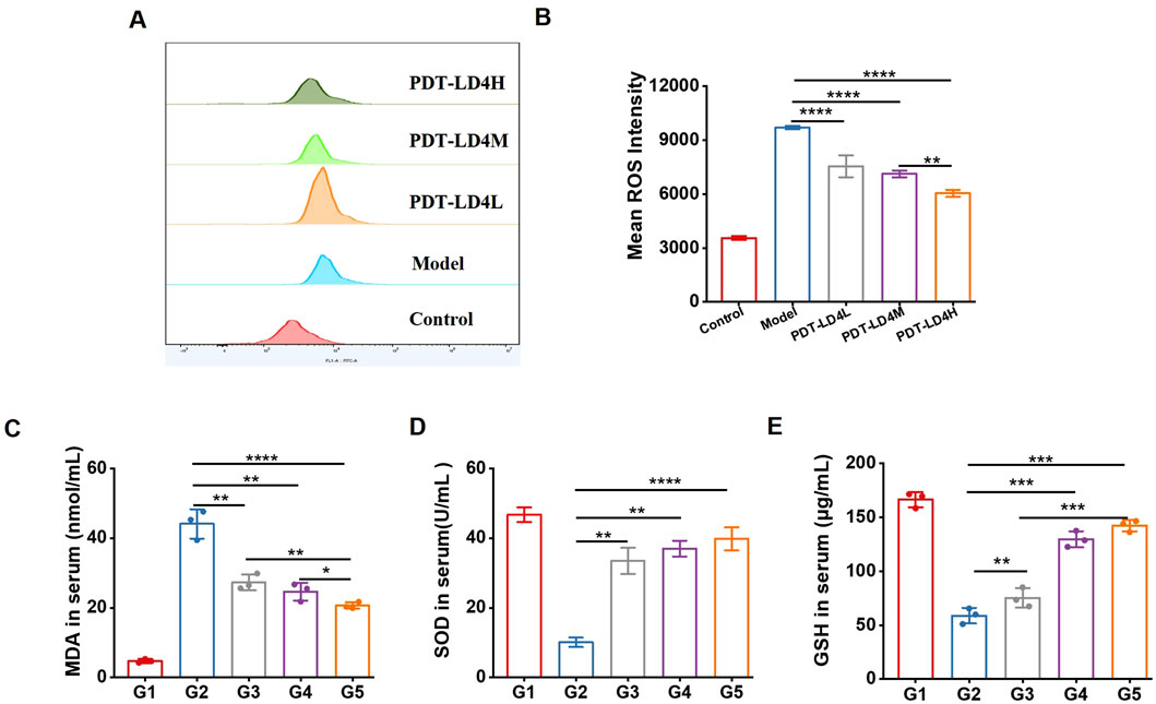 Figure 5. PDT-LD4 attenuated oxidative stress in BLM-induced PF mice. (A–E) The content of ROS (A,B) in HELF cells, MDA (C), SOD (D) and GSH (E) levels in mice serum were measured by flow cytometer and ELISA.