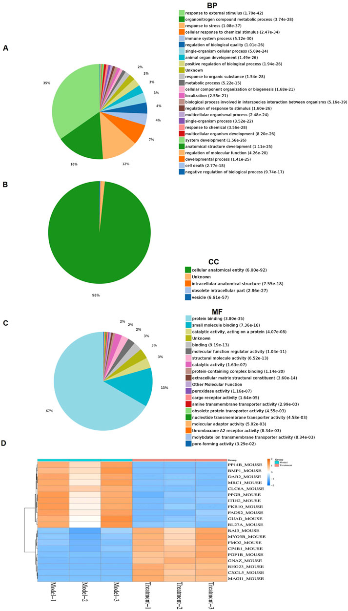 Figure 6. PDT-LD4 reprograms the protein profile of lung tissues in BLM-induced PF mice (A–C) All identified proteins were classified according to the first 20 gene ontology ratios sorted by enrichment degree (−log10 [P-value]) and protein number according to biological process, cell composition and molecular function. Over-representation analysis was used for functional enrichment analysis, and the t-test based on hypergeometric distribution. (D) Heat map of 40 differentially expressed proteins among the model and PDT-LD4 groups. Each column represented a sample, and each row represented a factor; red indicated elevated protein expression, green indicated decreased protein expression.