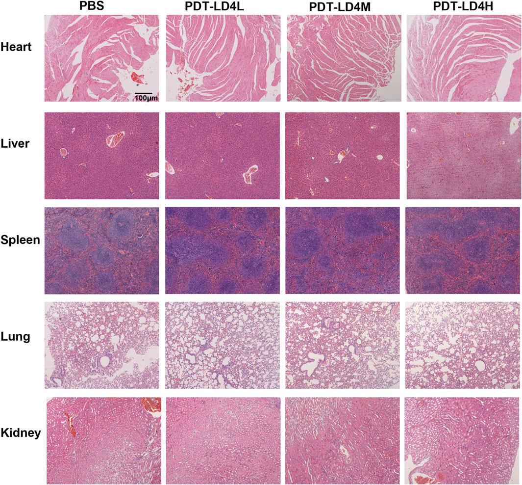 To evaluate the potential systemic toxicity of PDT-LD4, a comprehensive histopathological assessment was performed. Mice were randomly allocated into four groups: a normal control group and three treatment groups receiving low-, medium-, and high-dose PDT-LD4 (60, 120, and 240 μg/kg, respectively). Following the completion of the treatment regimen, major organs, including the heart, liver, spleen, lungs, and kidneys, were harvested for histological examination. Representative HE stained sections from each group were examined by light microscopy. As illustrated in Figure 8, the histological architecture of all examined organs appeared normal and well-preserved across all groups. In conclusion, the results demonstrate that PDT-LD4, even at the highest dose employed, does not induce observable systemic toxicity or damage to major organs, supporting its favorable safety profile for further therapeutic investigation.