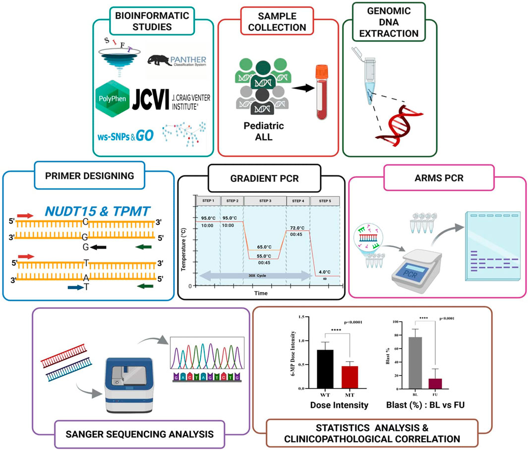 Methods: Missense SNPs in NUDT15 and TPMT were screened using SIFT, PolyPhen-2, PROVEAN, Meta-SNP, and SNPs&GO to identify high-impact variants. A multiplex ARMS-PCR assay was optimized and applied to 61 pediatric ALL samples. Genotyping results were validated by Sanger sequencing. Clinical correlations included hematologic toxicity, 6-MP dose intensity, and blast-percentage dynamics.