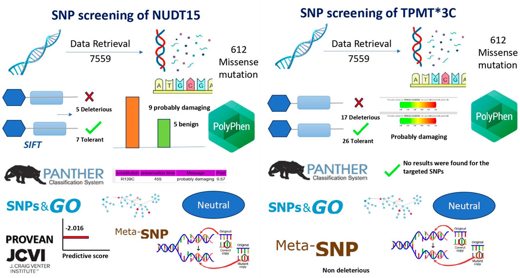 For maximum coverage and higher sensitivity in diagnostic screening, a comprehensive in silico analysis was performed to identify deleterious single nucleotide polymorphisms (SNPs) within the NUDT15 and TPMT genes. SNP datasets were retrieved from the NCBI dbSNP database (https://www.ncbi.nlm.nih.gov/snp/), yielding extensive entries for both genes. After deduplication, a subset of missense mutations was shortlisted for pathogenicity assessment. Multiple computational prediction tools were employed to evaluate the potential functional impact of non-synonymous coding SNPs (nsSNPs), including Sorting Intolerant From Tolerant (SIFT), PolyPhen-2, PROVEAN, PANTHER, SNPs&GO, and Meta-SNP. These tools were used to assess evolutionary conservation, structural and functional impacts, and disease association, thereby prioritizing variants with the highest likelihood of clinical relevance for subsequent genotyping.