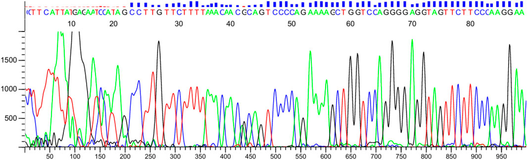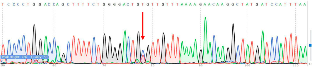 Figure 8. Verification of TPMT*3C by Sanger sequencing. The red arrow shows the position of the point mutation.