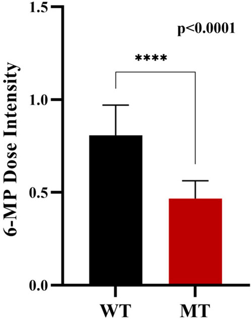The Wildtype patients show higher mean dose intensity of 6-MP whereas mutant type shows comparatively lower mean dose intensity of 6-MP. Patients with NUDT15 mutation (MT) receive a significantly lower dose of intensity due thiopurine intolerance associated with NUDT15. The planned dose of 6-MP given to ALL patients is 60 mg/m2. The median dose for wildtype patients is 0.79 (47.4 mg/m2) and for mutant type patient is 0.5 (30 mg/m2). The marked statistical difference (p < 0.0001) confirms that his dosage adjustment is consistent and not random (Figure 10).